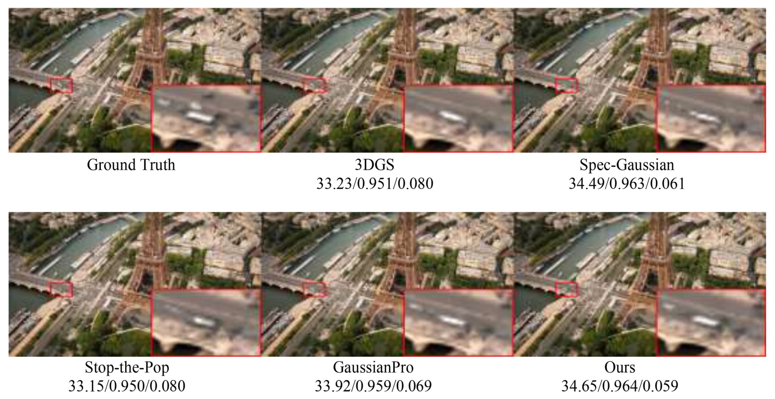 图6. Waymo数据集(Segment-102751)在4×下采样分辨率下的重建场景对比及对应的 PSNR/SSIM/LPIPS指标