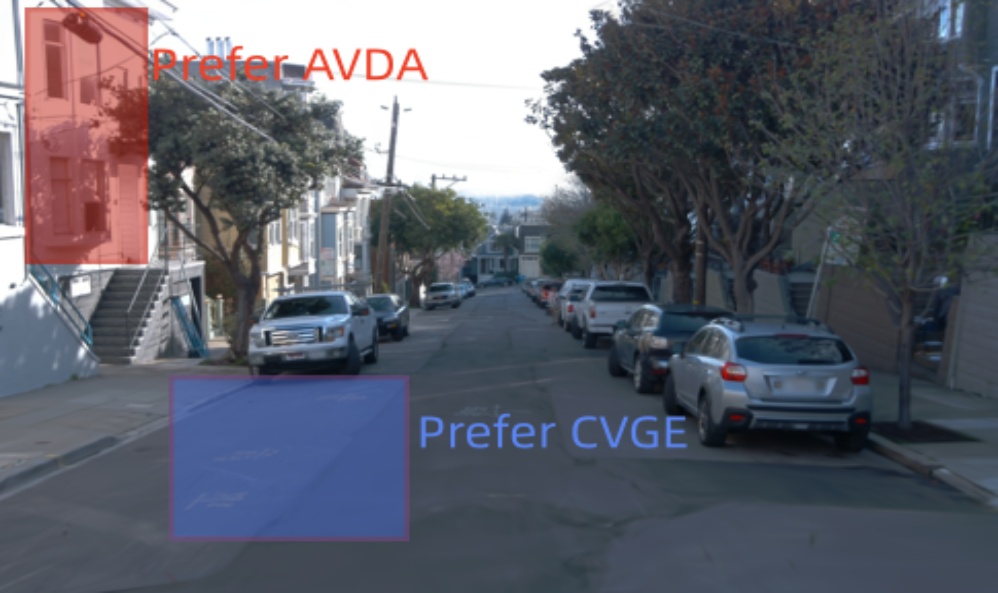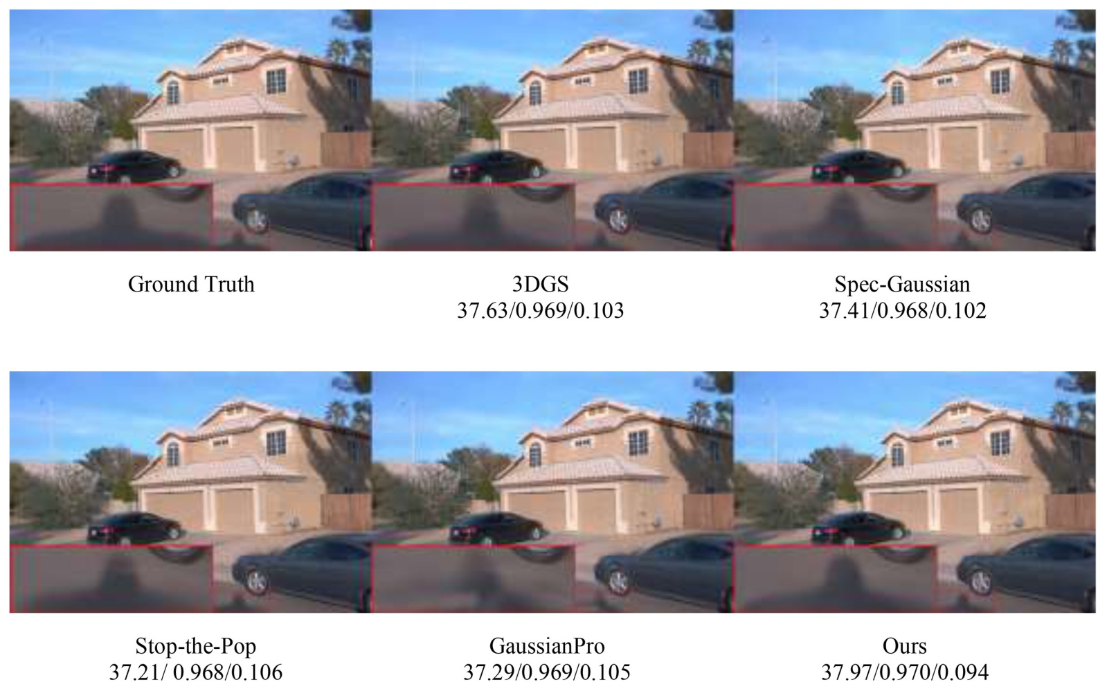 相反,侧重于视角外观建模的方法(如AVDA)对几何误差极为敏感:当几何不准确时,纹理往往被强行“贴”到错误的位置,从而引入重影;在稀疏视角设置下,会进一步产生形状与外观之间的错位。因此,仅关注几何或仅关注外观的策略,难以在稀疏视角与大规模场景下同时保证几何一致性与高质量外观。