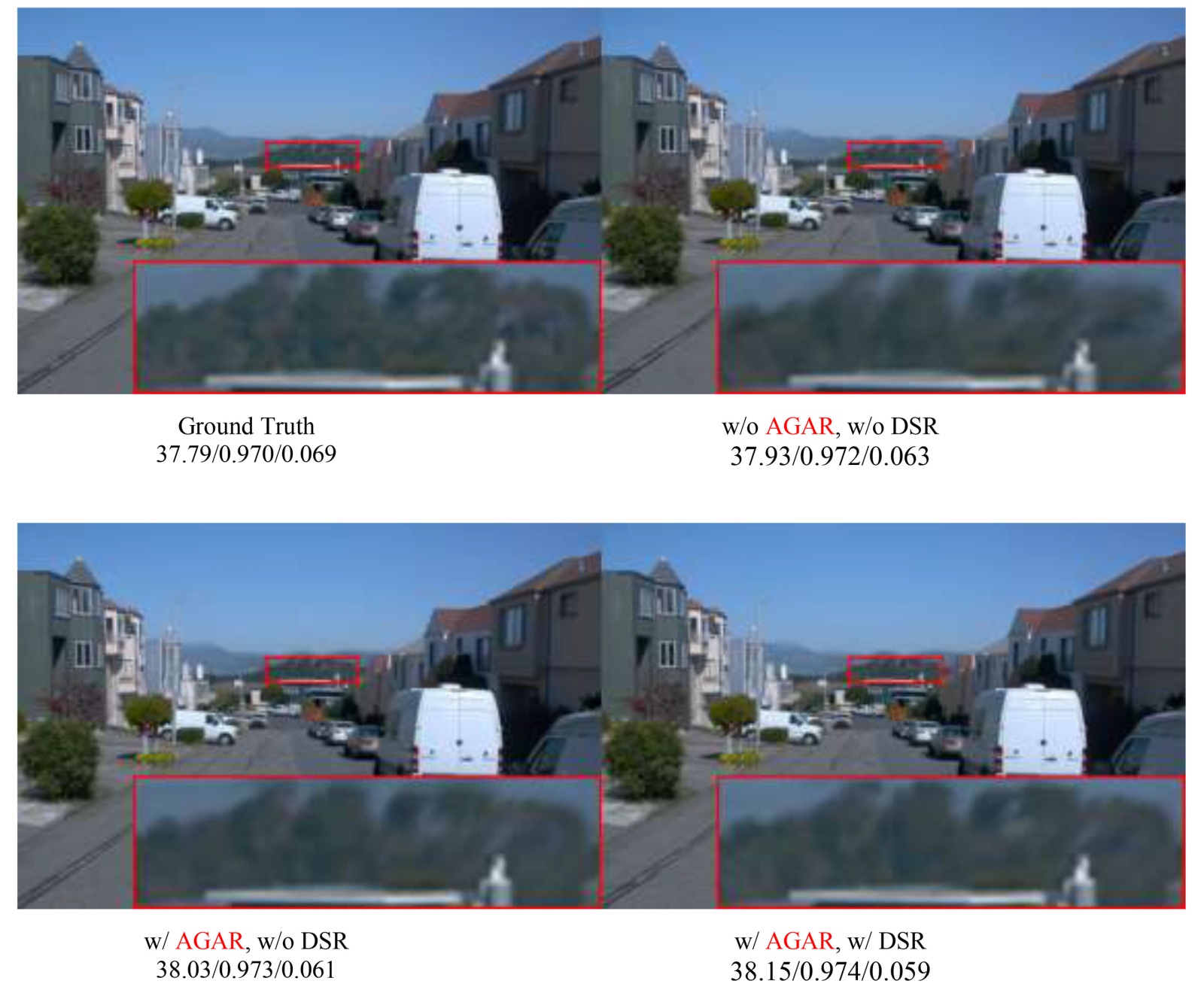 Figure 7. Ablation study on the Waymo dataset (Segment-100613) at a 4× downsampled resolution, along with the corresponding PSNR/SSIM/LPIPS values