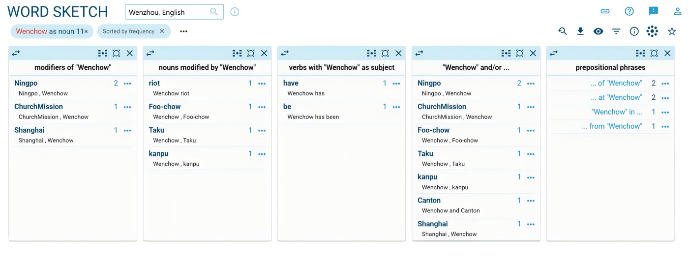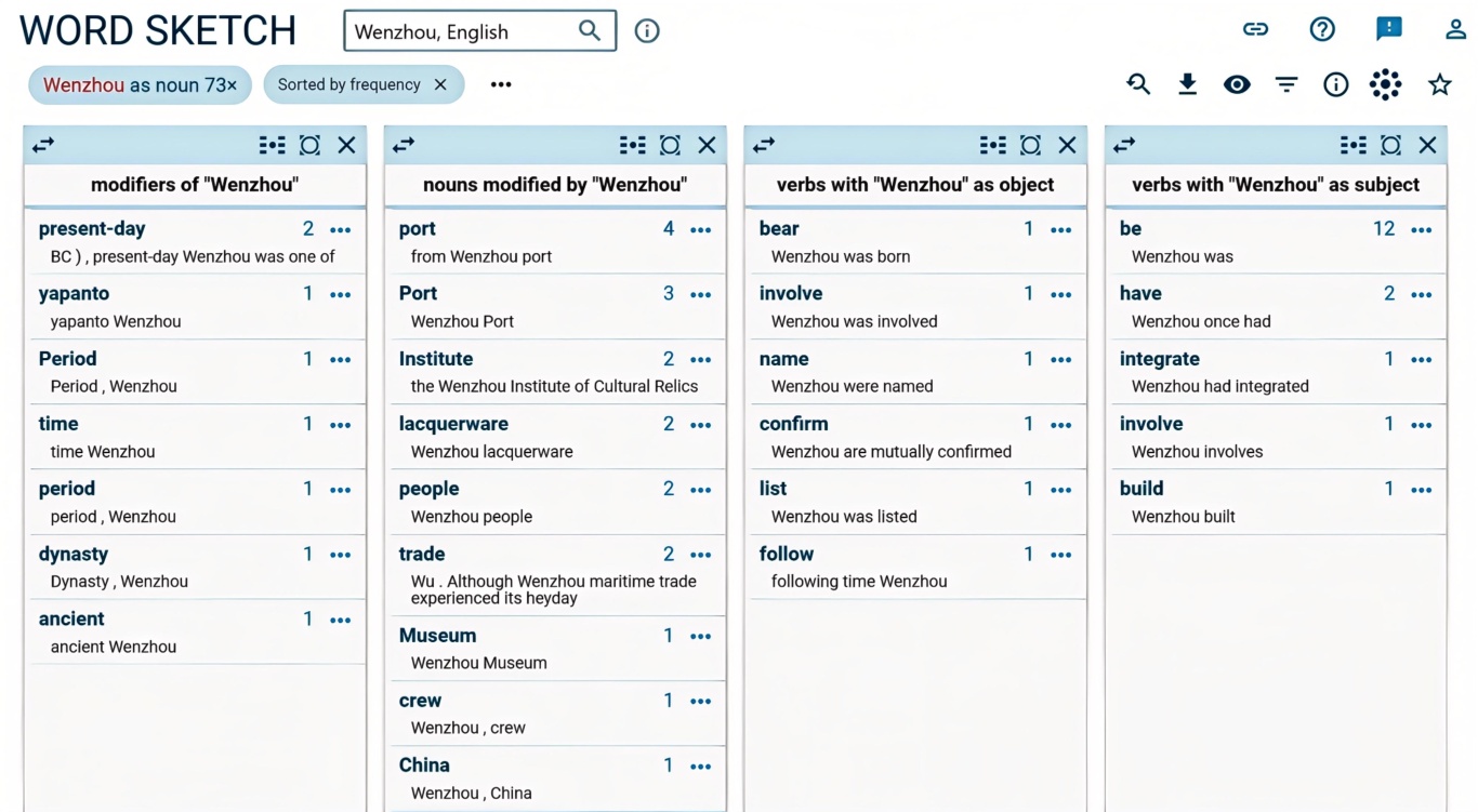 为进一步从语言层面分析温州在外宣文本中的形象呈现,本文将温州朔门古港英译双语语料导入Sketch Engine,再以“Wenzhou”,“Wenchow”为搜索关键词,显示其与不同词汇搭配的频率排名,结果如图1。
