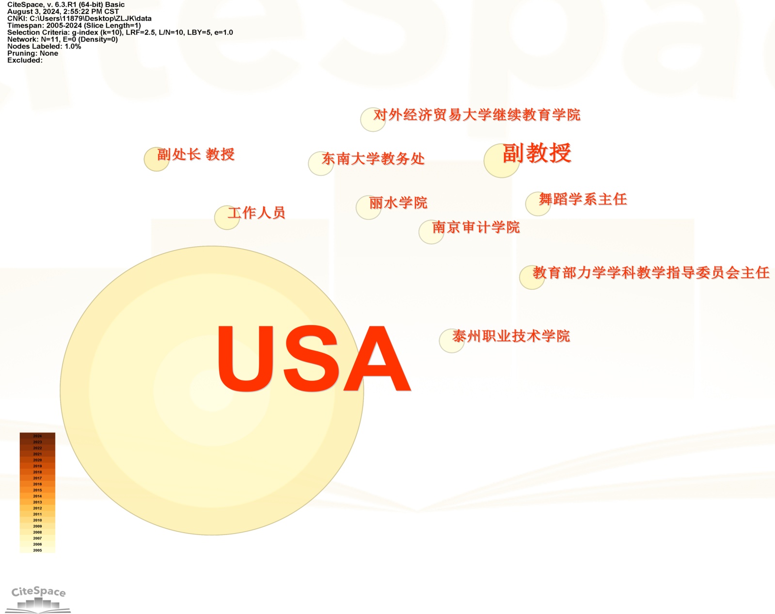 地区合作网络包含11个节点,0条连线,密度为0 (图2)。图中节点的大小与发文数量成正比;年轮的颜色代表发文的年份,年轮的宽度则代表不同年份发文的数量,且正相关;关键节点则由年轮最外边的颜色即中介中心性决定,其值需大于0.1;结果表明教育部力学学科教学指导委员会、对外经济贸易大学继续教育学院,东南大学教务处、南京审计学院虽然发文量不大,但是中介中心性较大,说明均有一定影响力,但国内各地区间合作网络力度弱,且影响力不强,提示国内学者之间需提高发文质量、同时还需加强院系和地区间的合作。