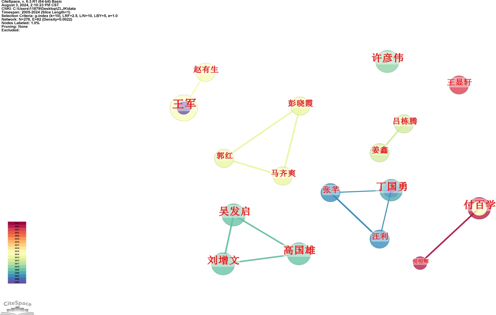 3513篇文献共包含276位作者[6],发文量排名前10位的作者(表2)中发文最多的作者是王军(4篇)。作者合作网络含276个节点,82条连线,密度为0.0022,基本形成研究团队以高国雄和丁国勇为主,相对连续地进行课程质量监控的研究工作,彭晓霞虽然发文不多,但也有相对固定的团队(图4)。