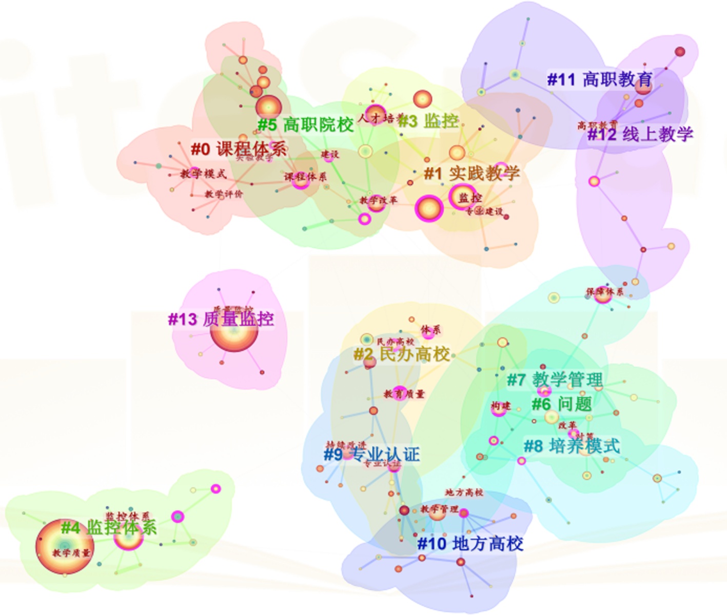 (logarithmic likelihood method, LLR)进行聚类,生成聚类13个(图6)。Q (聚类模块值) = 0.8072 (Q > 0.3),S (平均轮廓值) = 0.95 (S > 0.7),提示聚类可信。聚类#0 (课程体系)、聚类#1 (实践教学)、聚类#12 (线上教学)为课程方面研究;聚类#3 (监控)、聚类#4 (监控体系)、聚类#13 (质量监控)为质量监控方面的研究;聚类#7 (教学管理)、聚类#8 (培养模式)、聚类#9 (专业认证)为专业管理方面的研究;聚类#2 (民办高校)、聚类#5 (高职院校)、聚类#10 (地方高校)、聚类#11 (高职院校)为研究范围和对象方面的研究;聚类#6 (问题)为系列问题的研究。
