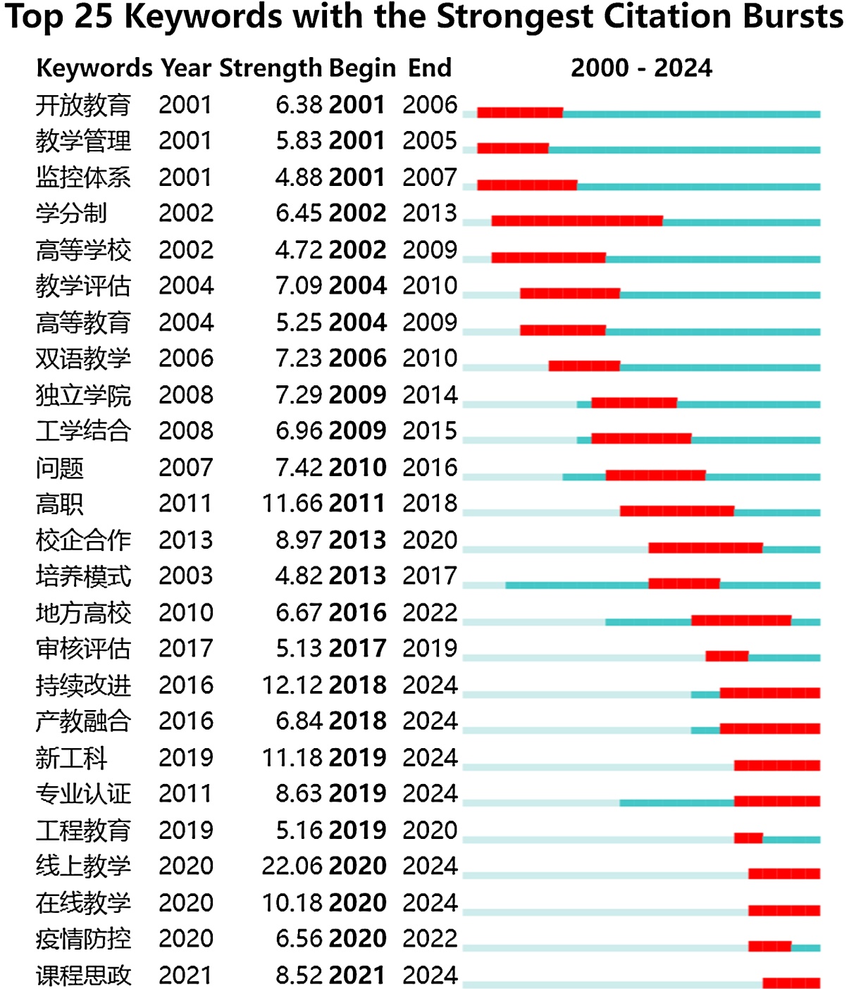 分析得到25个突现关键词,2005~2011年关键词突现高等学校质量监控等;2009~2024年关键词突现在高职、其他院校、地方高校、新工科等培养模式、审核评估、系列问题的持续改正等;2020~2024年关键词突现在线上教学、在线教学、课程思政、质量保证等(图7)。