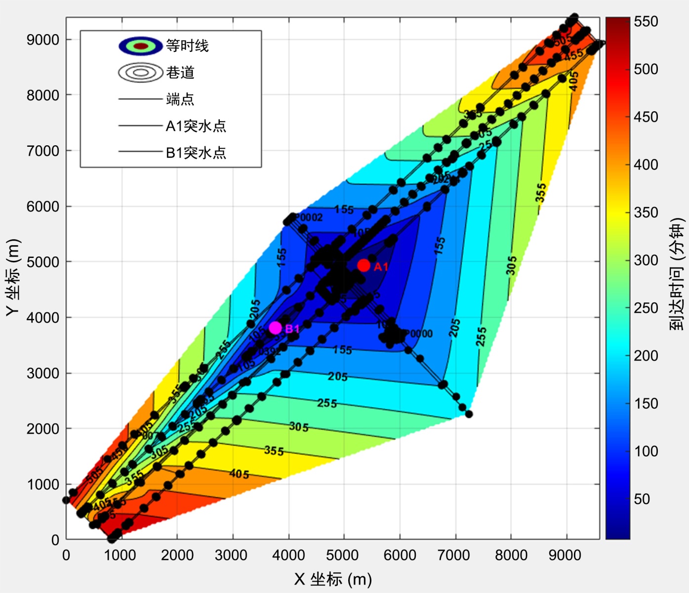 首次到达各巷道时间的等值线图