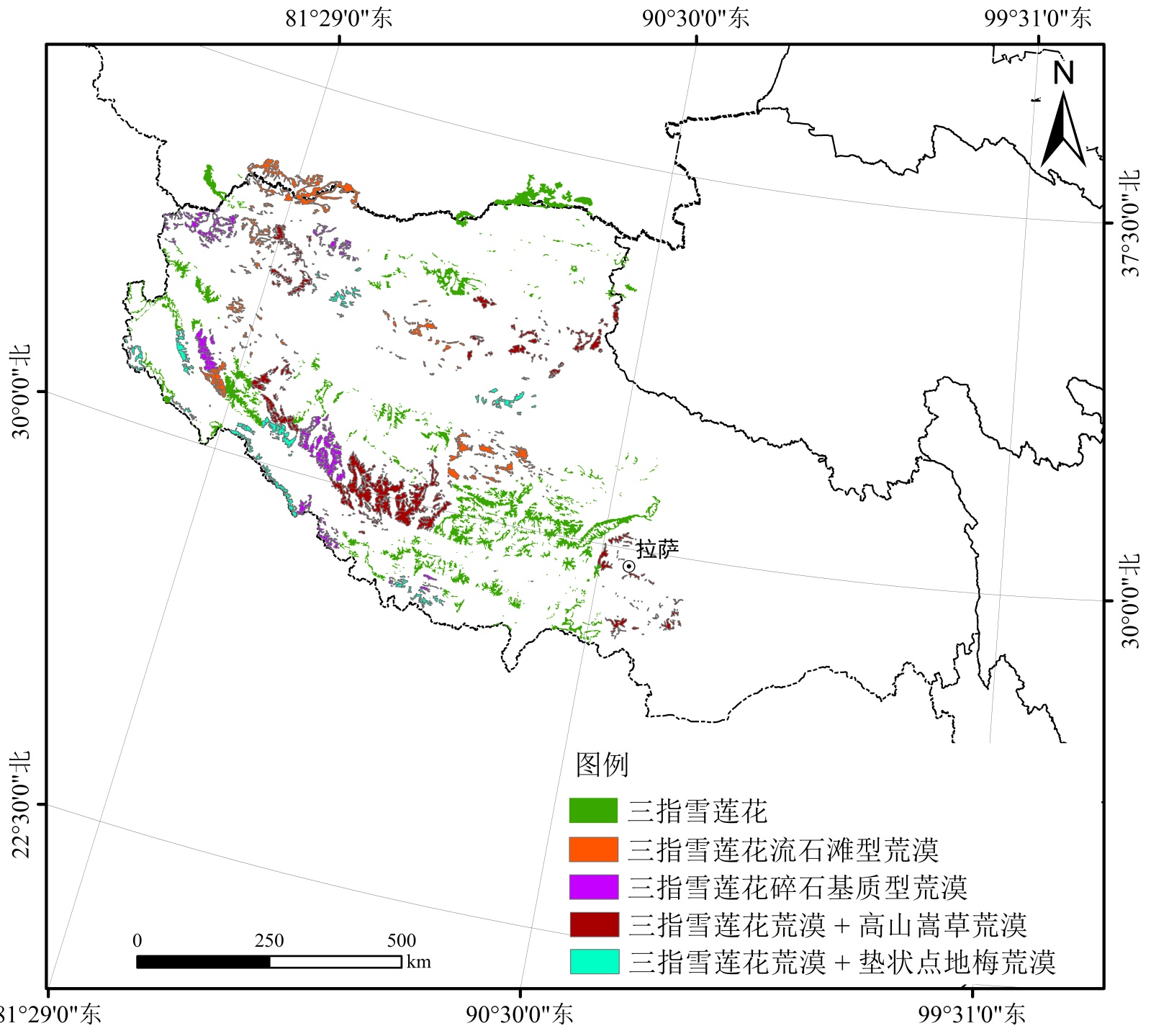 荒漠是我国主要生态景观类型之一,属于地球上自然条件极端恶劣的生态系统范畴。依据气候特征可划分为亚热带荒漠、温带典型荒漠与高寒荒漠三大类,不同气候地带可依据土壤基质类型再做细分,具体可分为砾质荒漠、沙质荒漠、壤土荒漠、黏土荒漠和盐碱荒漠等类别[12]。三指雪莲花群落隶属于荒漠植被型中的高寒半灌木–草本荒漠亚型,是高寒荒漠生态系统的典型代表类群[13]。