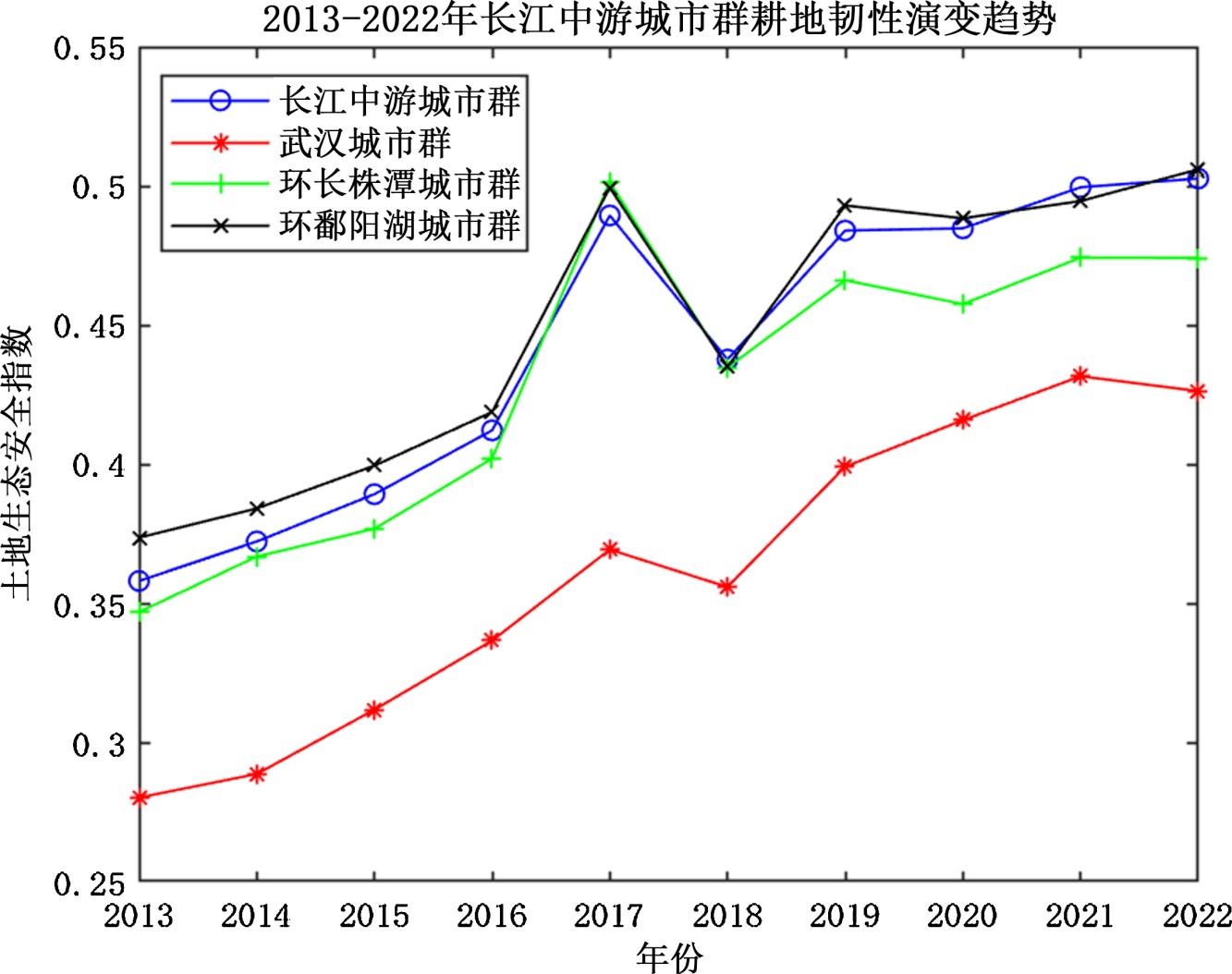 年,增幅达18.69%。2017~2018年出现小幅下降,降幅约为10.56%。武汉城市群土地生态安全指数从2013年的0.2806增长至2022年的0.4264。2013~2017年期间,指数逐步上升,其中2015~2016年增幅约为7.95%。2017~2018年出现小幅回调,降幅约为3.63%。环长株潭城市群土地生态安全指数从2013年的0.3472增长至2022年的0.4742。2013~2017年期间,指数持续上升,其中2016~2017年增幅显著,约为24.67%。2017~2018年出现下降,降幅约为13.27%。环鄱阳湖城市群土地生态安全指数从2013年的0.3738增长至2022年的0.50602。2013~2017年期间,指数稳步上升,其中2016~2017年增幅约为19.22%。2017~2018年出现小幅下降,降幅约为12.87%,随后持续回升,至2022年达到最高值,表明环鄱阳湖城市群在生态保护方面取得了长期成效。