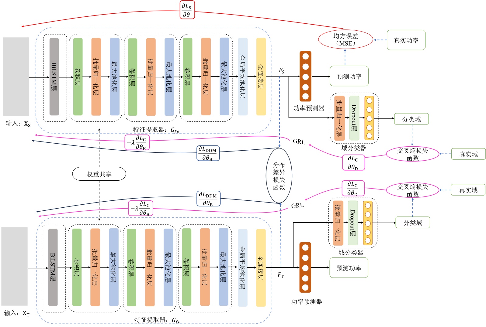 BiLSTM-CNN-TL模型由两部分组成:一是BiLSTM-CNN基础模型,用于完成风电功率预测的基础任务,包括特征提取和功率预测;二是域分类器,作为对抗组件用于区分数据样本的域来源。在训练过程中,采用领域自适应方法,通过分布差异度量(Distribution Discrepancy Metric, DDM)最小化源域和目标域之间的特征分布差异,同时引入对抗训练思想,利用域分类器区分源域和目标域特征,促使特征提取器生成域不变的特征,在特征空间中实现源域和目标域的分布对齐,完成跨域知识迁移。