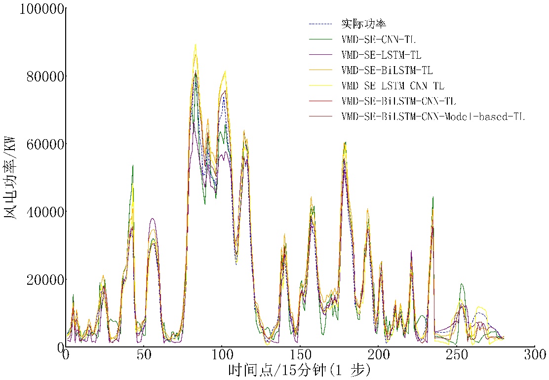 为进一步验证所提出方法的有效性,将其与四种主流深度学习预测模型和基于模型的迁移学习方法(源域预训练 + 目标域微调)进行对比分析。其中,基于模型的迁移学习方法采用与本文方法相同的模型结构,将其命名为VMD-SE-BiLSTM-CNN-Model-based TL。同时还建立了VMD-SE-CNN-TL、VMD-SE-LSTM-TL、VMD-SE-BiLSTM-TL、VMD-SE-LSTM-CNN-TL等一系列对比模型,以全面评估所提方法在风电功率预测任务中的优越性。