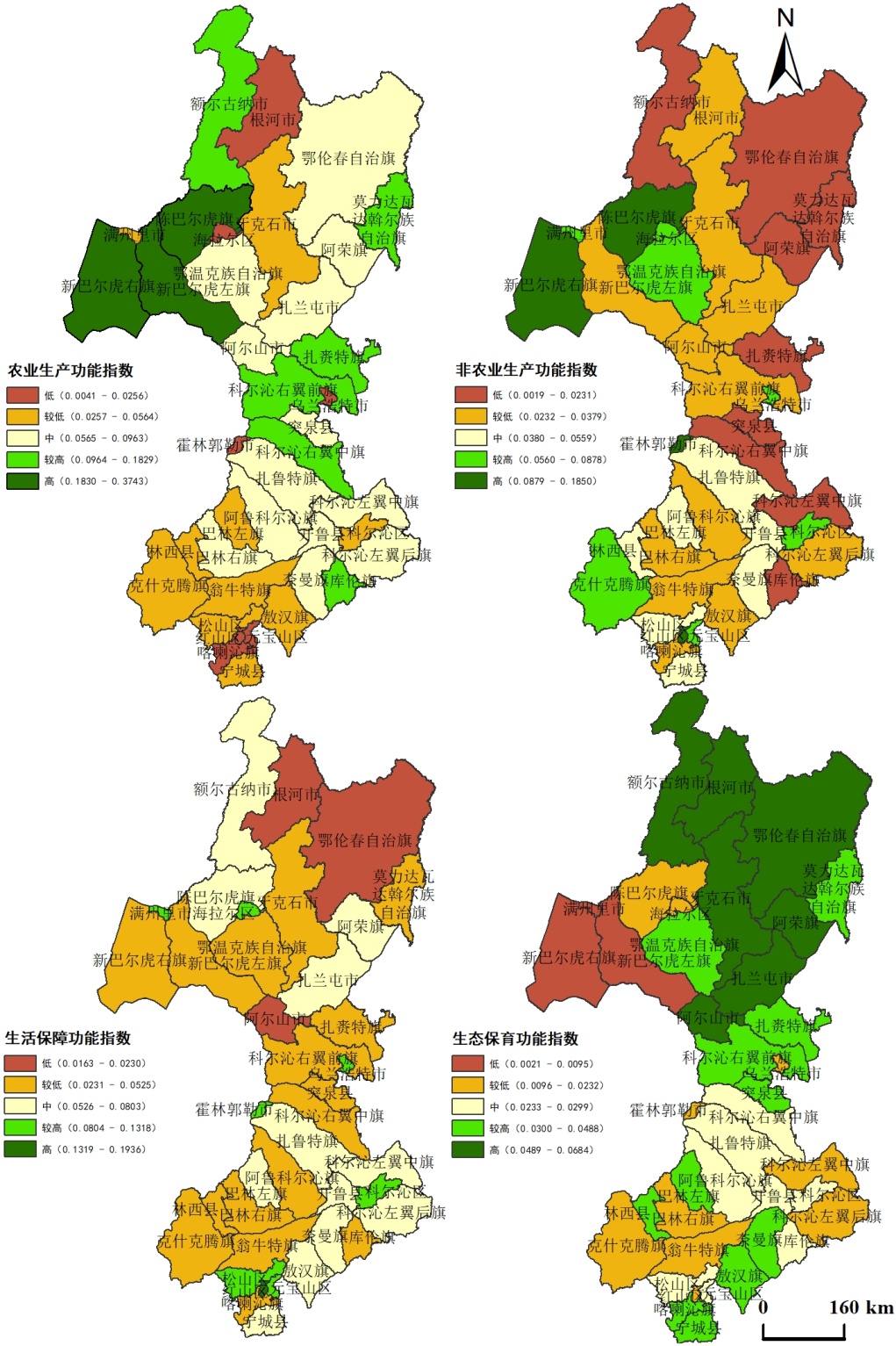 蒙东地区生活保障功能指数介于0.0163~0.1936,表明蒙东地区的整体生活保障功能水平中等偏低。其中高值区和较高值区共有8个县域,占整个研究区域的20.5%,其中高值区仅有红山区,较高值区包括满洲里市、海拉尔区等7个县域。这些地区的经济产业基础和公共基础设施建设较好,城镇化水平不断提升,交通、教育医疗等资源优势明显,与非农业生产功能高值区和较高值区分布范围相似;中值区共有12个县域,主要分布在蒙东地区的西北部和东南部,占整个研究区域的30.8%;较低值区和低值区共有18个县域,占整个研究区域的46.1%,其中低值区包括根河市、鄂伦春自治旗和阿尔山市,这些地区受区位、地形地貌和产业基础等因素影响,生活保障能力低,需加快提升社会保障能力,加速公共基础设施建设。