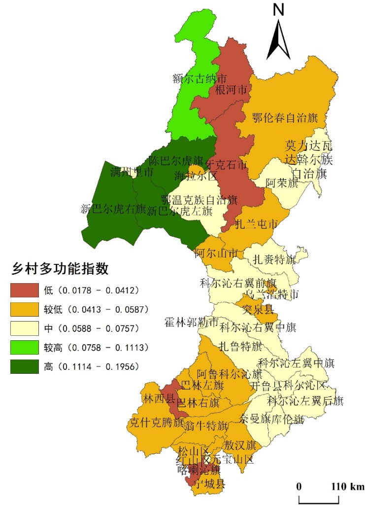 Figure 3. The spatial distribution pattern of the multi-functional index of rural areas in eastern Inner Mongolia