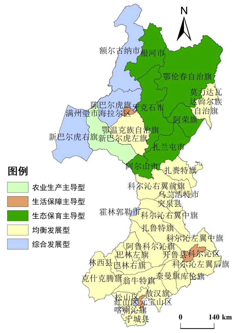 该类型县域共10个,功能特征和发展导向鲜明。(1) 农业生产主导型。主要分布在新巴尔虎左旗,该类区域地形平坦辽阔,草场广布,水源充足,土壤肥沃,以农牧业为主。未来应适度扩大粮食生产和畜牧的规模,针对高寒气候特征,优先发展耐寒、短生育期作物,如燕麦等,同时可以依托满洲里口岸,试点中蒙跨境牧场共建。(2) 生活保障主导型。主要包括海拉尔区、科尔沁区和元宝山区3个县域,该类区域拥有完善的公共服务基础设施,交通通达性高,多为城市和人口集聚区。未来应更加重视人口老龄化问题,推广“社区嵌入式养老服务中心”,进行公共服务的精准供给;鼓励乡村利用边境贸易发展特色农产品加工等产业,政府提供资金和技术支持,繁荣乡村经济;继续加强公共设施建设,进行高寒设施强化,推进城乡交通网络建设,加大医疗、教育等的投入。(3) 生态保育主导型。主要包括根河市、鄂伦春自治旗等6个县域。该类地区未来应加大生态保护力度,建立多元化生态补偿机制,对生态保护区域进行财政转移支付,确保当地居民能够从生态保护中受益;建设生态保护区,禁止过度开发和破坏生态环境;发展生态旅游业,利用独特的自然景观吸引游客,带动当地经济发展;进行环境敏感区治理,通过退耕还林、退牧还草等工程对退化和污染的地区进行生态修复,恢复生态系统功能,打造生态宜居型的美丽乡镇。