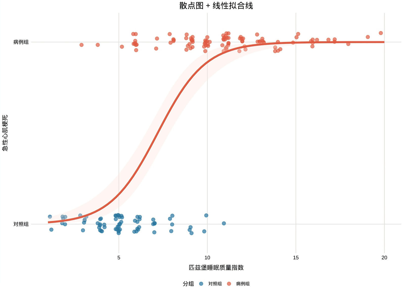 为进一步探讨PSQI总分与AMI风险的关联模式,先使用限制性立方样条(RCS)非线性检验模型分析,结果显示未发现显著的非线性关系(非线性检验P = 0.6316),支持使用线性模型。继而进行线性分析,绘制散点图并叠加拟合趋势线(图1)。结果显示,病例组(AMI患者)的PSQI总分整体分布高于对照组。散点分布及其拟合趋势共同表明,随着PSQI总分的增加,个体发生AMI的风险呈现持续上升的趋势。