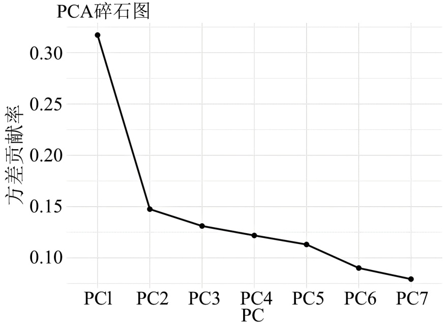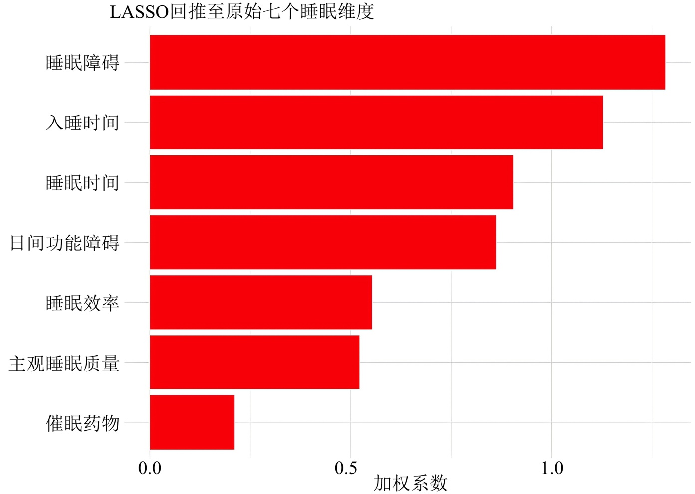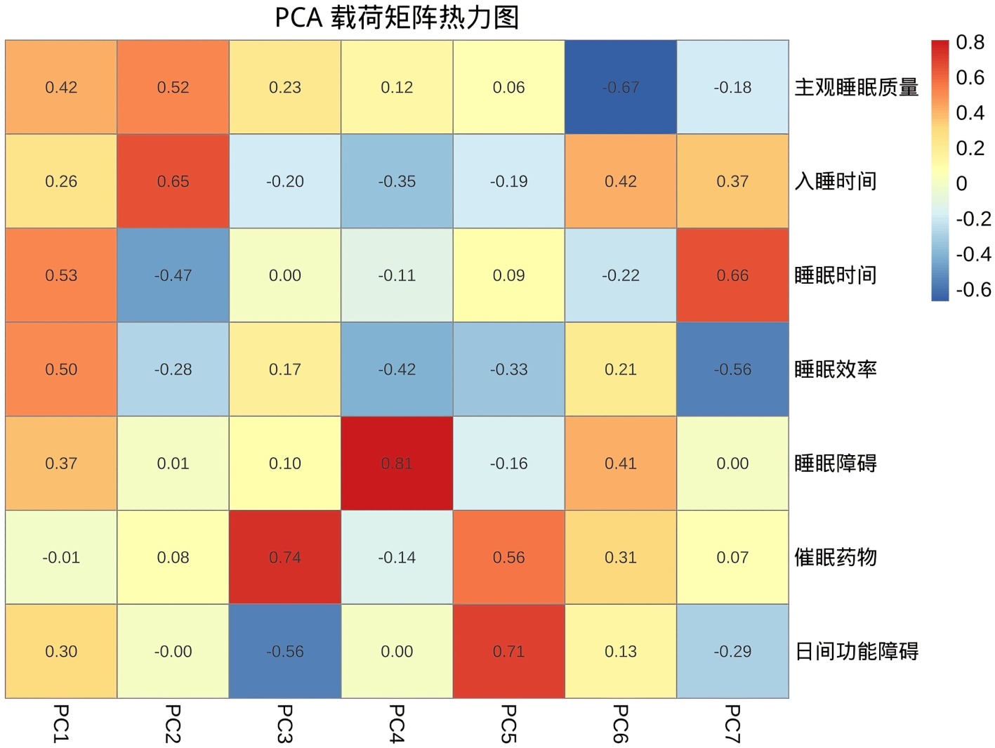 为探讨不同睡眠维度对急性心肌梗死(AMI)发病风险的贡献,对七个睡眠成分(主观睡眠质量、入睡时间、睡眠时间、睡眠效率、睡眠障碍、催眠药物使用及日间功能障碍)进行主成分分析(PCA)。PCA共提取七个主成分,其解释方差的分布见碎石图(图2)。同时绘制载荷矩阵热图(图3),图中显示各主成分与原始睡眠维度之间的相关结构。进而以PCA所得主成分得分为自变量,AMI发病为因变量,采用LASSO Logistic回归进行变量筛选。在λmin条件下,PC1至PC7的系数均未收缩至零,全部主成分对模型预测均具贡献,其中PC1的回归系数最大(β = 2.11),其影响力最为显著。再将分析结果回溯至原始睡眠维度,并加权回推得到回推系数,根据结果得到回推系数条形图(图4)。结果显示,睡眠障碍、入睡时间、睡眠时间与日间功能障碍的回推系数绝对值较大,这些维度在构成AMI发病风险中贡献最为突出。