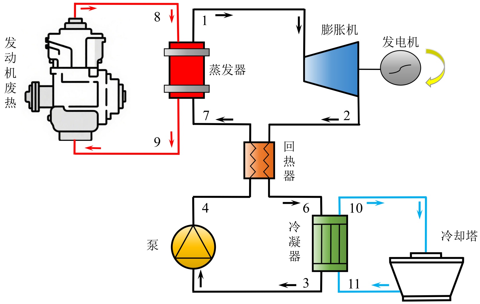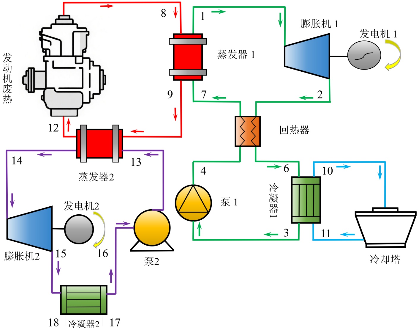 在“双碳目标”的战略指引下,提升化石能源利用效率、降低碳排放是推动能源结构转型与可持续发展的关键方向。内燃机作为汽车、船舶及分布式能源系统等多个领域中应用广泛的重要动力装置,其运行过程会产生大量余热,这些余热通常占燃料总能量的30%~50%,蕴含着显著的节能潜力。因此内燃机余热的高效回收对节能减排具有重要意义。目前内燃机余热回收技术近年来取得了显著进展,从早期的单一循环向多循环协同系统发展,显著提升了能量利用效率。