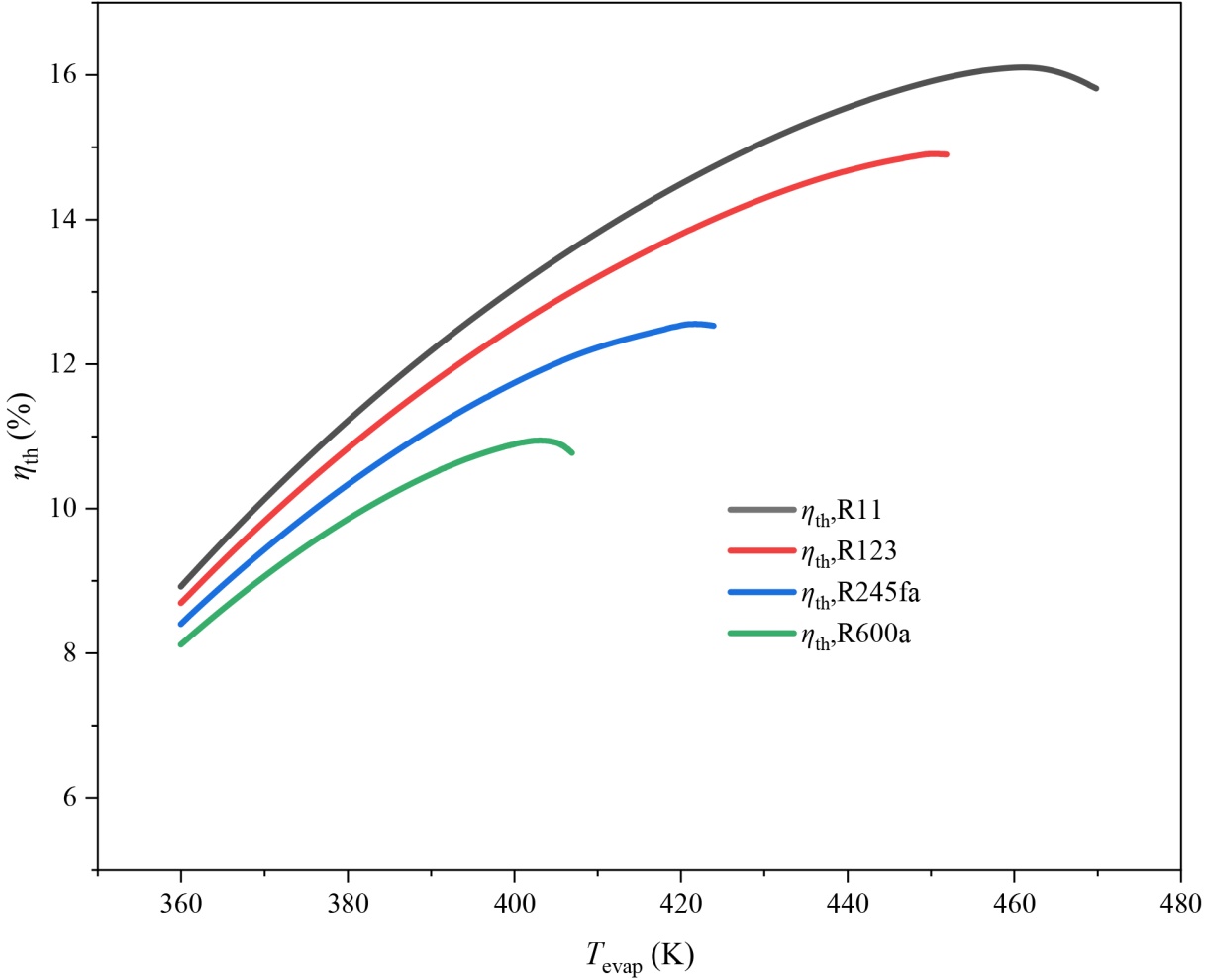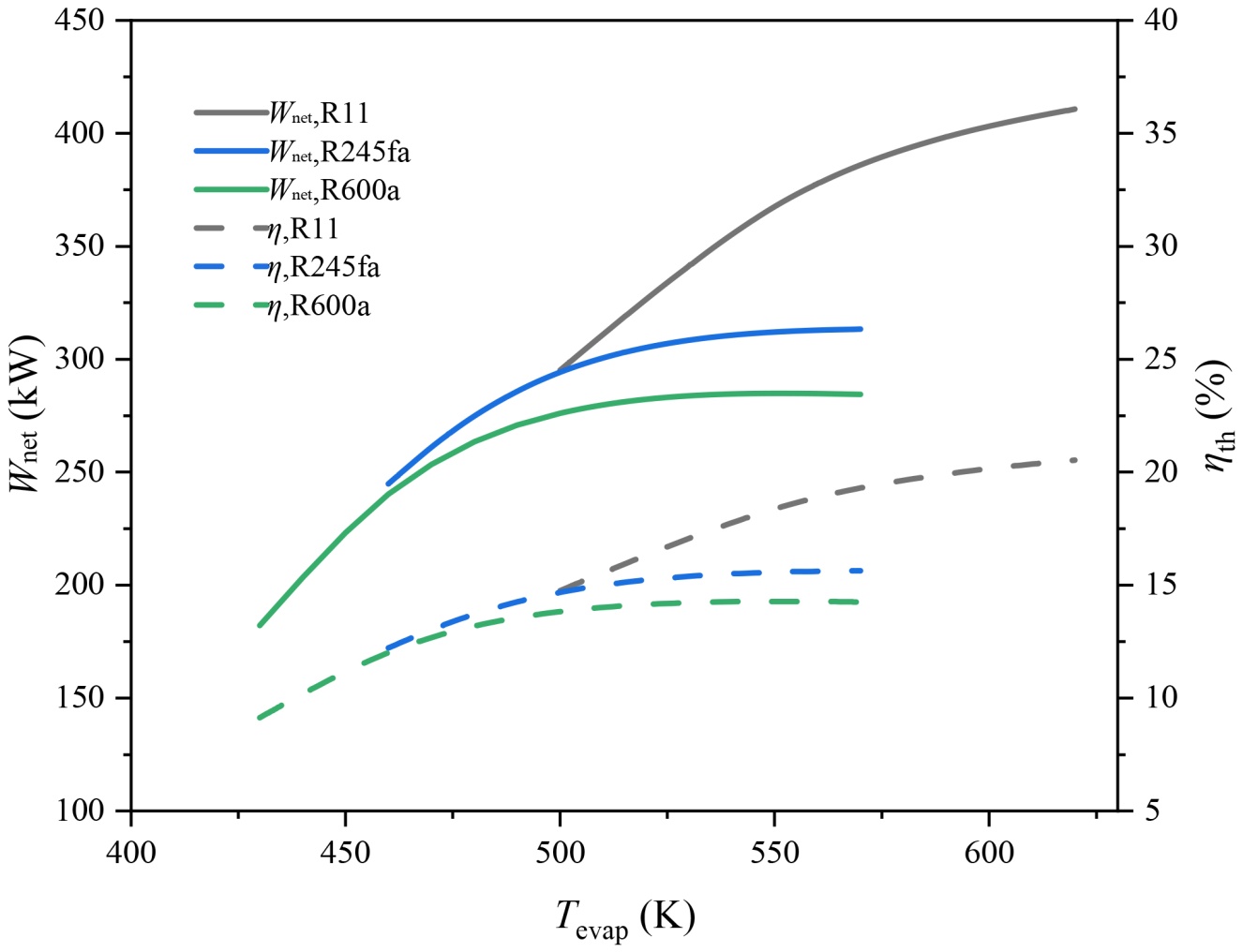 在跨临界ORC系统中,鉴于有机工质临界压力鲜有超过10 MPa的特性,本研究将所有受试工质的蒸发压力统一设定为10 MPa。在此基础上逐步提升蒸发温度,直至蒸发器内的最小换热温差达到30 K时停止升温,此时系统仍可实现对热源热量的充分吸收。需特别说明的是,R123因热稳定性阈值较低,未纳入本跨临界循环工况的研究范畴;而R245fa与R600a两种工质,在蒸发温度升至前述最大限值之前便会发生热分解反应,因此本研究将其热分解温度界定为蒸发温度的上限边界条件。如图8所示,R11仍然具有最好的性能表现,净功为419.7 kW,热效率为21.1%。更高的ηth值意味着在从废气中回收的相同热量下,可以获得更多的净功率输出。
