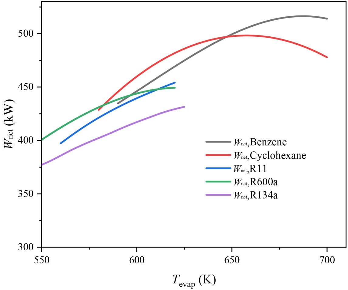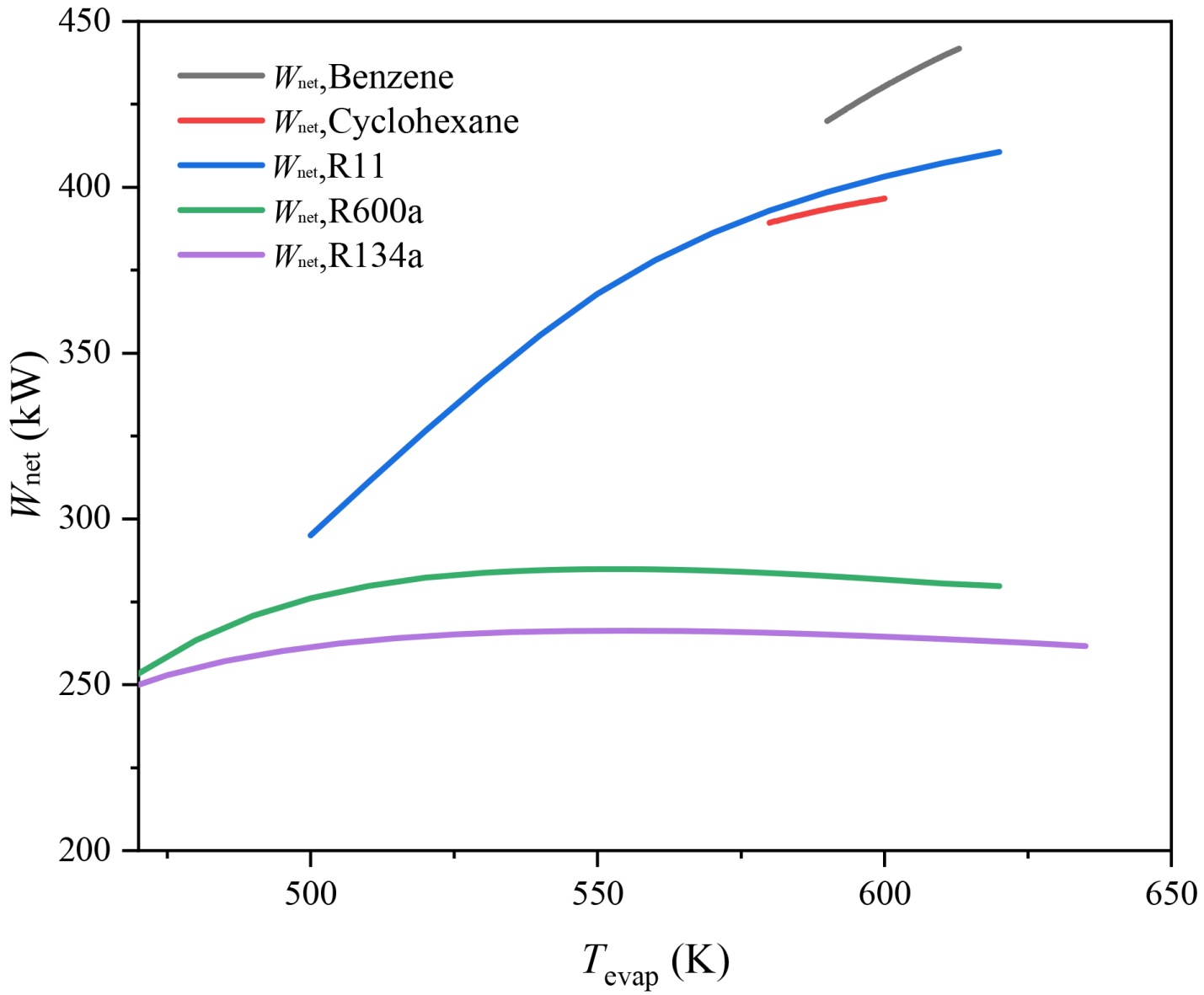 Figure 6. Variation of cycle net power of different working fluids with evaporation temperature (subcritical ORC)