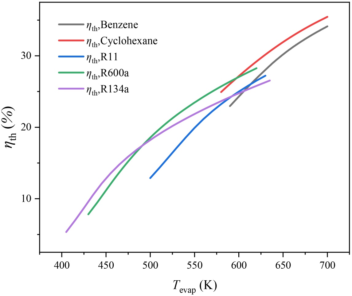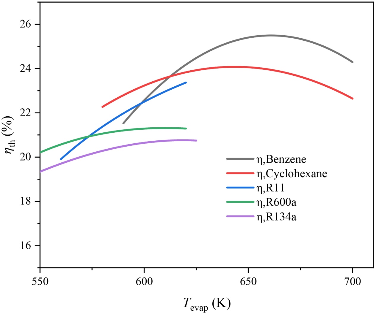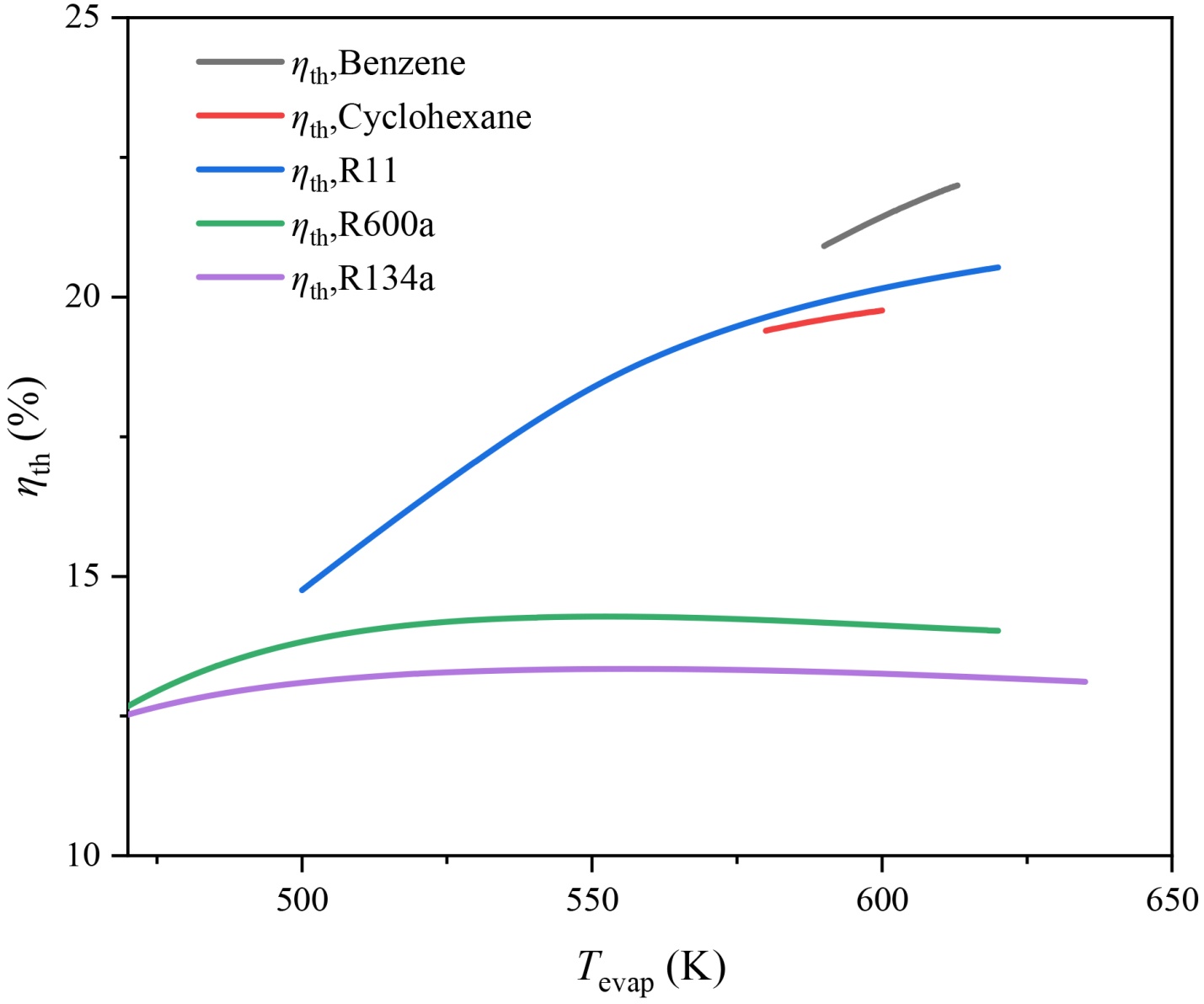 针对前述工质与热源温度匹配性仍存在提升空间的问题,本研究进一步拓展工质临界温度研究区间至370 K~570 K,选取苯、环己烷、R11等工质,探究跨临界ORC系统中,受临界参数与热稳定性约束条件下,工质净输出功率与热效率随蒸发温度的演变规律。图9和图10展示了不同工质循环净功和热效率随蒸发温度的变化。实验结果表明,苯作为循环工质时表现出最优性能,其最大净输出功率可达441.8 kW,对应最大热效率为22%。对于临界温度较高的工质而言,其在蒸发器内可实现更高的蒸发参数,进而增大工质比焓降与膨胀功。在此过程中,比焓降的提升幅度显著超过工质质量流量的衰减幅度,因此系统性能随蒸发温度的升高呈现持续提升的趋势。与之相反,R134a、R600a等工质随蒸发温度升高,比焓降提升与质量流量衰减这两个影响功率输出的核心因素之间的作用梯度逐渐缩小;当蒸发温度升高至某一阈值后,质量流量衰减的负向作用占据主导地位,导致系统净输出功率呈现先升高后降低的变化特征。在系统与热源充分换热的前提下,热效率的变化趋势与净输出功率保持一致。