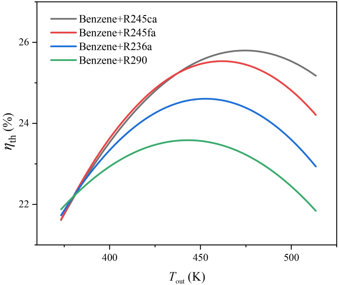 图14和图15展示了顶循环为苯和底循环工质为R245ca、R245fa、R236fa、R290的净功输出和热效率随顶循环热源出口温度的变化。数据表明,在一定温限范围内,底循环更换临界参数更高的有机工质,余热回收性能更高。当工质为R245ca时,最大净功为523.86 kW,最大热效率为25.7%。