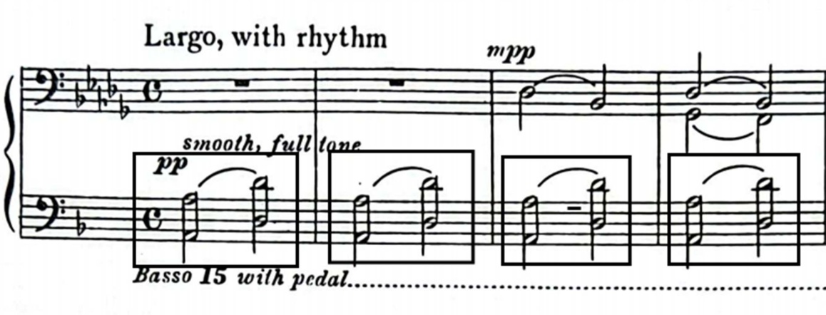 当我们对考埃尔先生的生平和这首作品中主要的音乐特点、重要的创作手段都有所了解之后,对于我们再进行学习演奏就会有着更好的帮助。《玛瑙瑙的潮汐》曲式结构简单,核心围绕着海水潮汐的运动变化为动机展开,速度要求广板(largo with rhythm)强调旋律的律动。