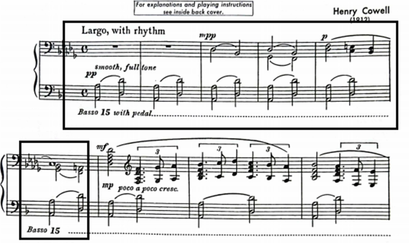 音簇是考埃尔标志性的创作手法,指三个及以上相邻音高以二度叠置关系同时发声。考埃尔音簇是建立在泛音列上端自然存在的密集音响的存续和延伸。与传统和弦三度重叠的逻辑不同的是,考埃尔强调密集的二度重叠更加具有张力,改变传统三度和弦和声功能性连接,突出音响的表现力,同时更加注重音色的表达。
