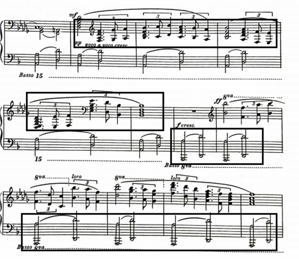 如图1的音符,左手音簇时值多以二分音符为主,音高从A->D低音升到高音,下一个小节再次重复A->D直到结束。左手部分节奏大框架上十分规整统一,昭示着海浪一次一次地冲击上岸重复循环,模拟海浪的层次与力量。