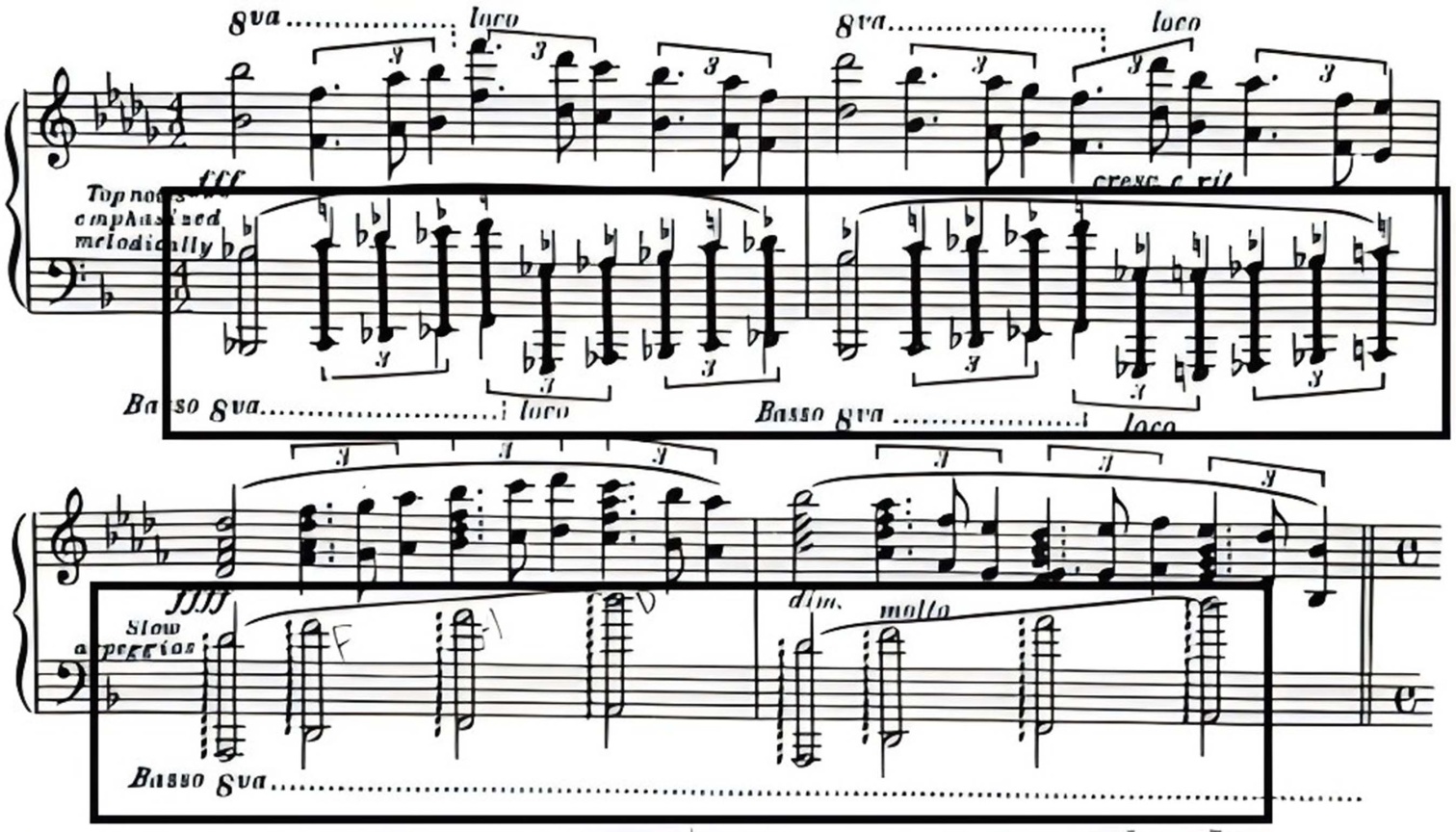 ② 黑键音簇:当纯八度音程的上方有升号,需要演奏出纯八度中的所有黑键。