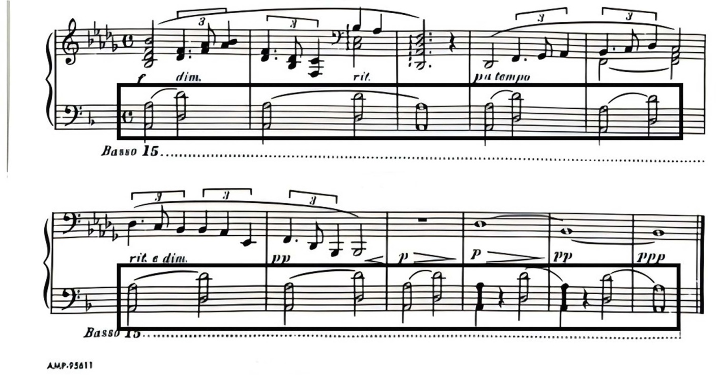 如图5的音符,主题再现,动机简化,力度减弱速度减慢,律动趋于平缓再次回归平静的本质。如同潮汐一般缓缓退去,最后结尾声音变成从弱变成极弱ppp,音簇碎片化出现,最终以持续的低音收尾,潮汐消散还原宇宙初始的平静。