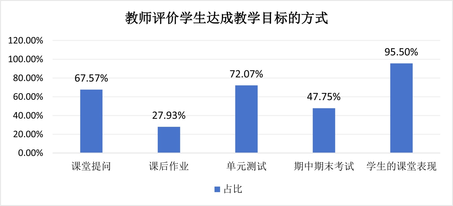 在确保教学目标达成的路径上,教师通常的做法首先有教师提问法,教师依据对学生学习情况的了解,通过对不同层次的学生依据其学情针对性的提问促进教学目标的达成;其次是学生举手法,教师在讲解某一知识点后,通过让掌握知识目标的同学或没掌握的同学举手并给予其针对性的指导以确保教学目标的达成。最后是课堂测验法,通过课堂测验促成课堂教学目标的达成。笔者研究表明有超过95%的教师会选择学生的课堂表现当作评价方式,此比例明显高于其他选项,单元测试以及课堂提问作为第二梯队的评价手段,和其他方式形成了较为十分突出的区隔(见图1)。