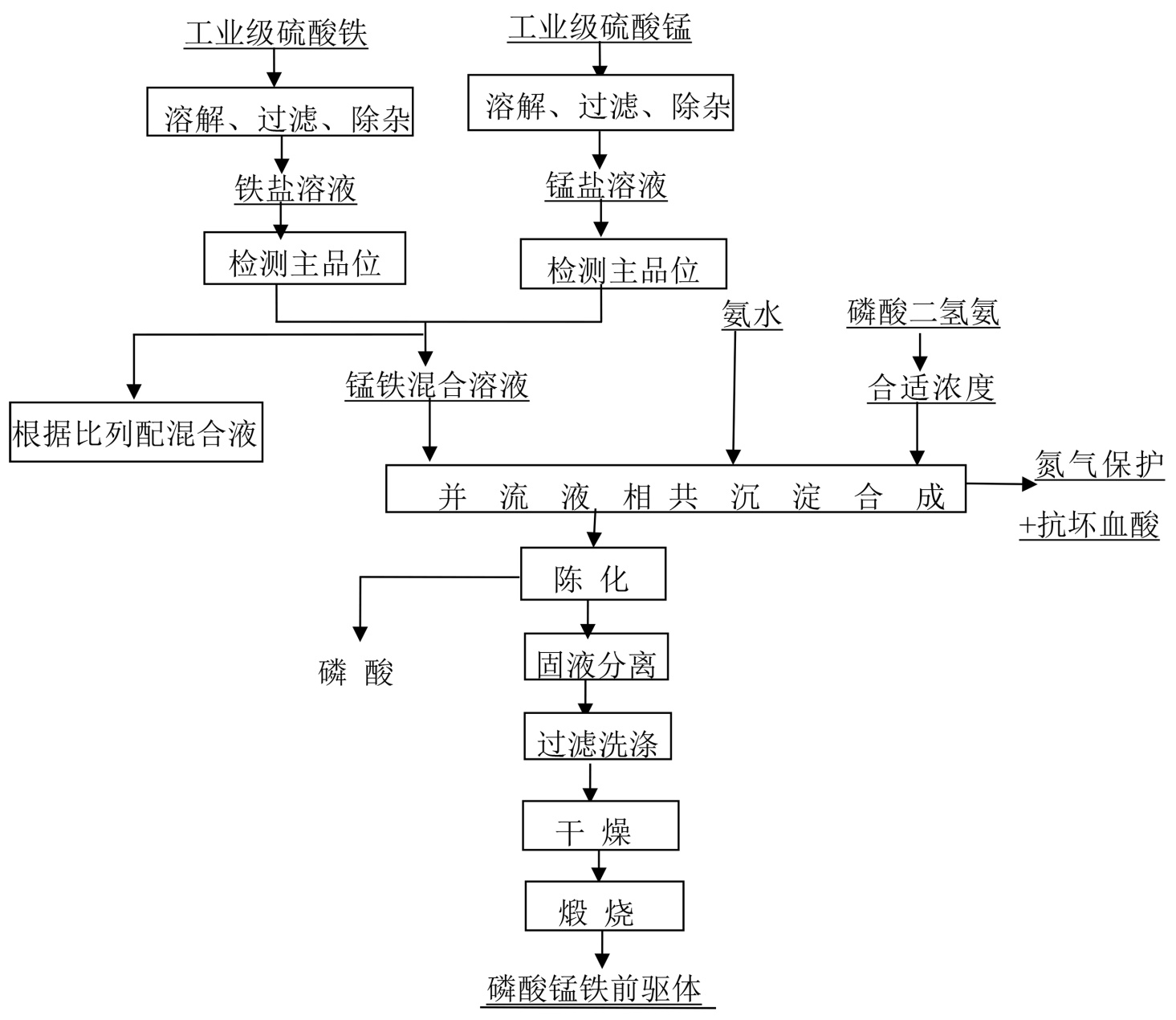 (3) 常规的磷酸锰铁前驱体制备方法有氨法、钠法,采用铁盐、锰盐、磷酸盐混合,加入氧化剂、用氨水(或者氢氧化钠)调节pH值,生成带结晶水的磷酸锰铁前驱体,高温煅烧脱水后生成目标产物,存在Mn、Fe沉降速率不一致、Mn、Fe元素分布不均匀、出现焦磷酸锰与磷酸铁的混合物、锰、铁在原子层面不能均匀分布。