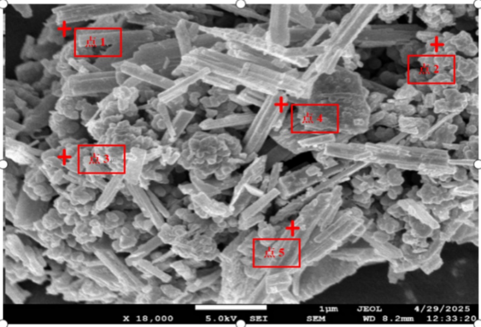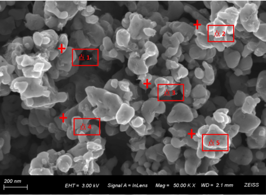 通过对图9同一批次产品磷酸锰铁锂进行不同点位电子图像(SE) 1~5进行EDS点扫,得出数据Mn含量在19.43%~19.51%,Fe含量在13.77%~13.84%之间,Mn、Fe波动 < 0.1%,磷酸锰铁锂正极材料实现了原子级别的均匀分布。
