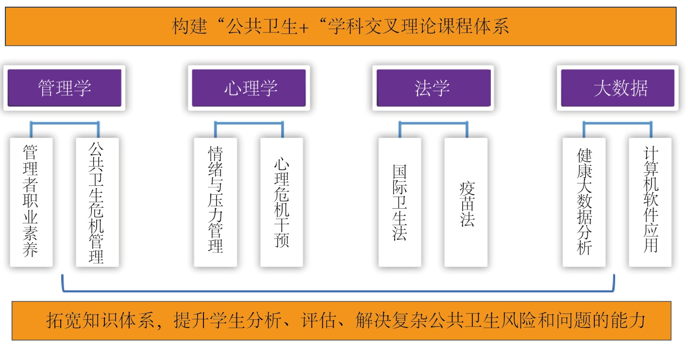为满足公共卫生事业对复合型人才的需求,学院在原有专业基础上,增设管理学、心理学等学科交叉课程(图1),拓宽学生理论知识体系,提升学生分析、评估、解决复杂公共卫生风险和问题的能力[11]。