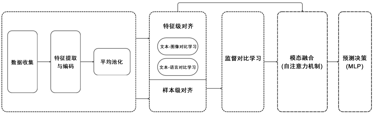 基于用户需求分析,项目组构建了多模态数据治理框架。该框架遵循多模态机器学习的基本范式[3],包含特征编码、双对齐机制,监督对比学习和模态融合与预测四个核心环节。