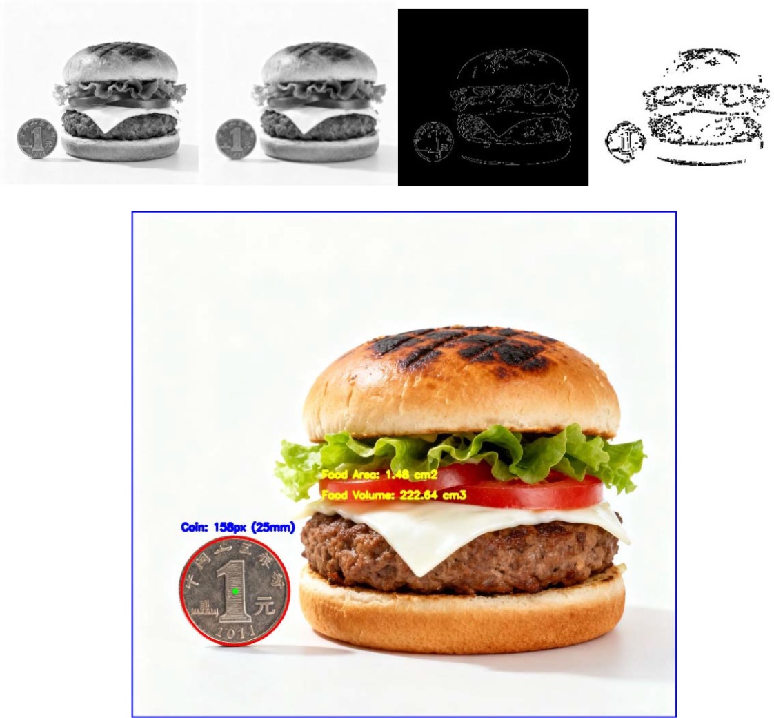 轻量化视觉规范:图像大小不同,采用硬币检测的OpenCV校准法,需要用户在吃饭拍摄时,放置一枚货币,将硬币作为对比,经过OpenCV中HoughCircles方法检测出该枚硬币的图形轮廓,计算该枚硬币的像素直径,已知硬币的直径通过换算公式
