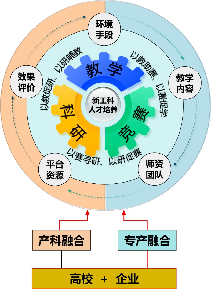 新一轮科技革命和智慧智能技术的迅速发展,促使行业头部企业直面技术创新并成为技术转移转化升级的主要载体,高校需要面对行业对高技能应用创新复合型人才的需求开展系统性培养方案的调整优化。因此,产业发展与科学研究、专业建设与产业链的深度融合成为必然趋势,也是推动新工科人才培养的关键动力。通过教学内容与产业需求对接、科研创新与企业实践对接、人才培养与岗位能力对接,打通教育链、产业链、人才链和创新链,可提升人才培养的针对性、实效性与创新性。
