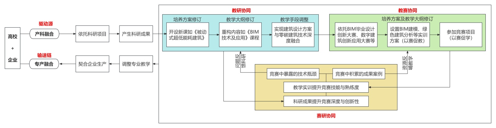 使学生在课堂上即可接触到行业最前沿的知识与技术,提升课程的创新性与工程适应性。科研成果的融入,不仅丰富了教学内容,也促进了教学方法的革新,在这一过程中,科研不仅是知识创新的源泉,更是教学质量提升的重要驱动力。教师通过科研活动不断总结教学经验,反思教学方法,优化教学内容结构,形成科学研究反哺课堂教学的持续机制。最终,实现教师科研水平提升、教学质量提升与学生创新能力提升的三重共赢,构建起以知识创新驱动教学创新的智能建造教研协同机制。