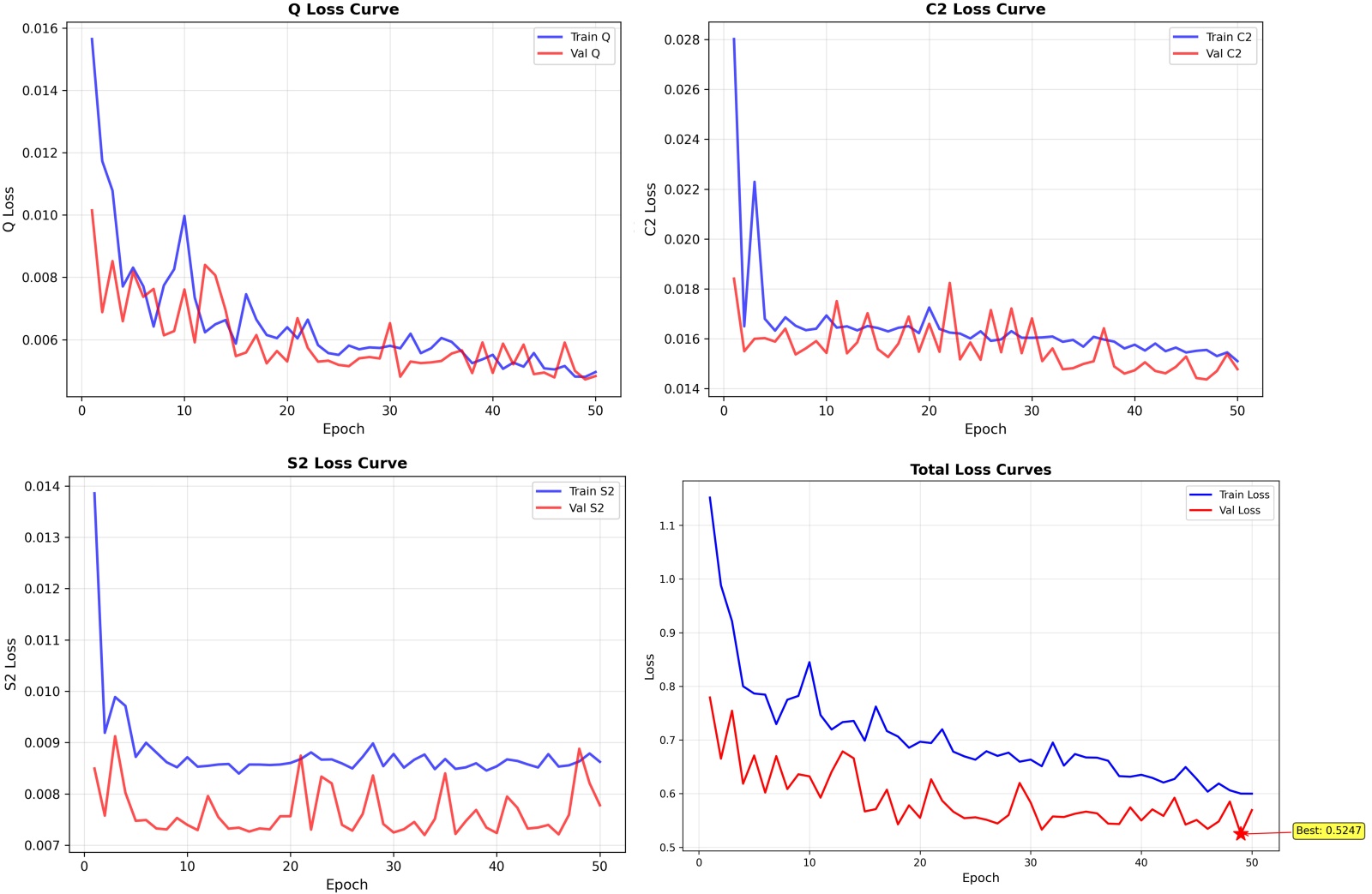 从各任务损失的变化情况来看,抓取区域可行性损失下降速度最快,并在较早阶段达到稳定状态,表明网络能够较为容易地学习抓取点的空间分布特征。相比之下,抓取角度损失与抓取宽度损失的收敛速度相对较慢,其中抓取宽度损失由于属于连续回归任务,对局部几何信息较为敏感,因此在训练过程中表现出一定的波动性,但整体仍保持稳定下降趋势。随着训练的进行,总损失逐渐趋于平稳,且训练集与验证集损失变化趋势基本一致,未出现明显的震荡或反弹现象,说明网络训练过程稳定,不存在明显过拟合问题。