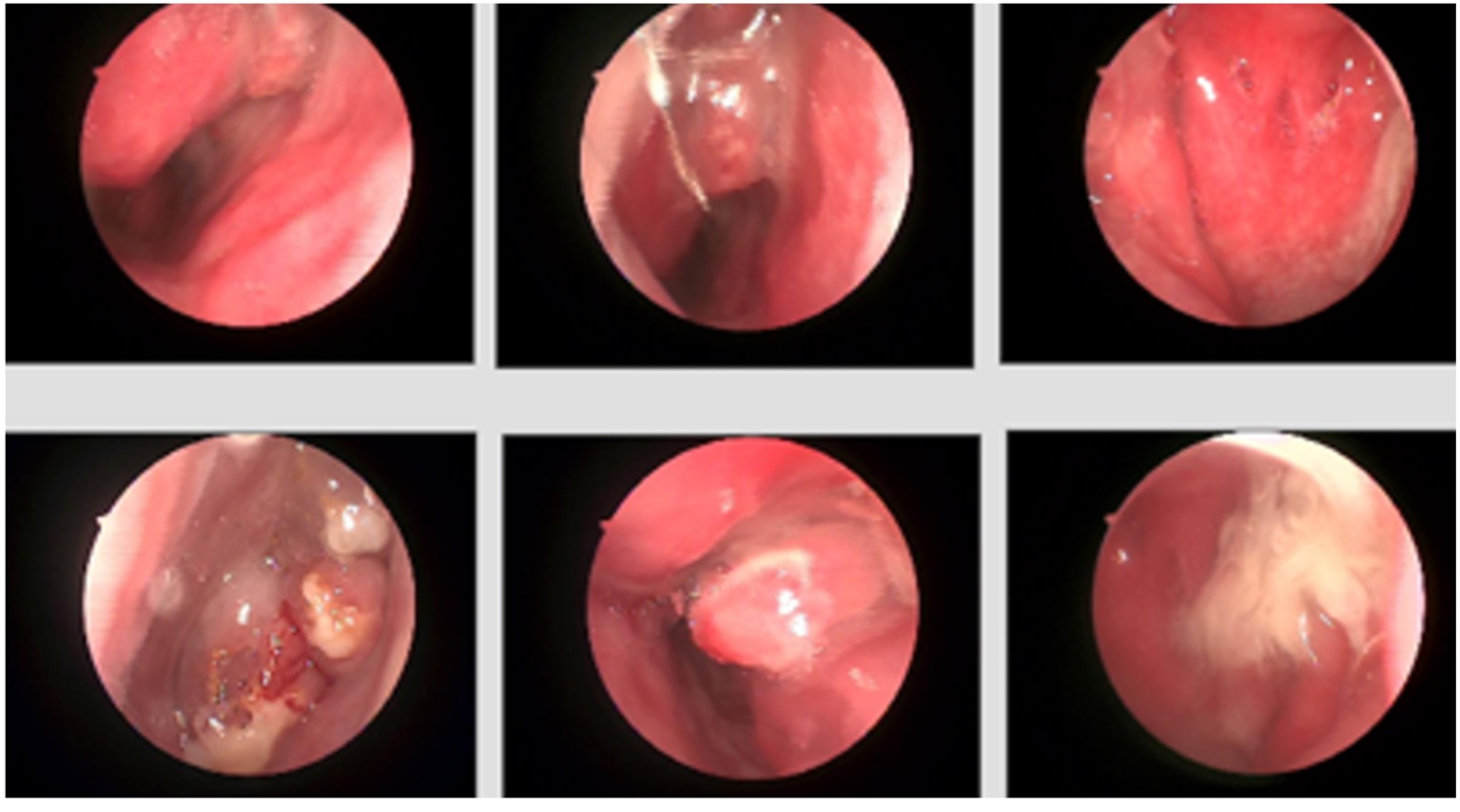 3) 专科查体:双侧鼻腔黏膜苍白水肿,见白色黏涕样分泌物,双侧中鼻道及嗅区见半透明样新生物。