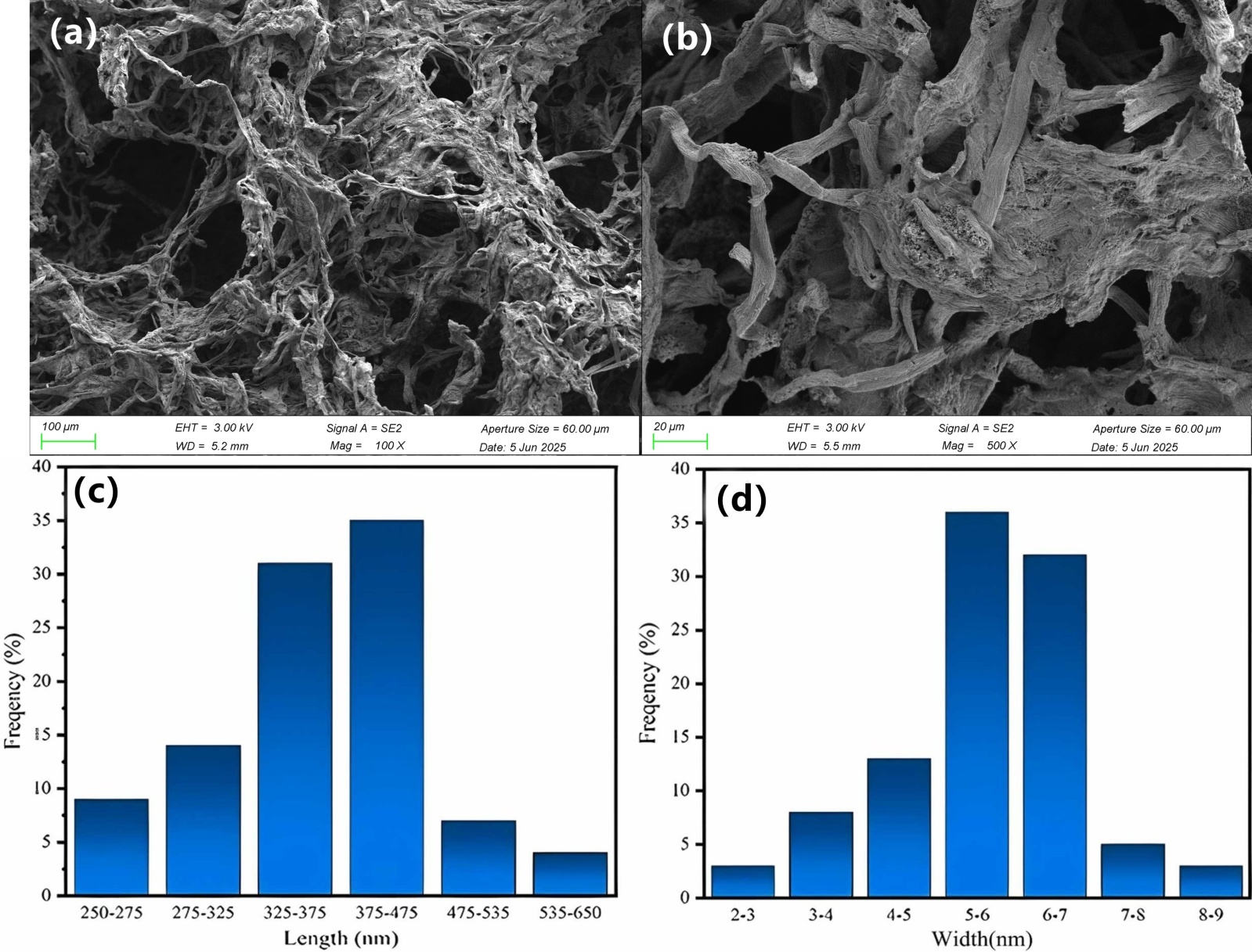 图1. CNFs的SEM图像,放大倍数为×100 μm和×20 μm (a),(b);通过Image J获得的CNFs长宽分布直方图(c),(d)