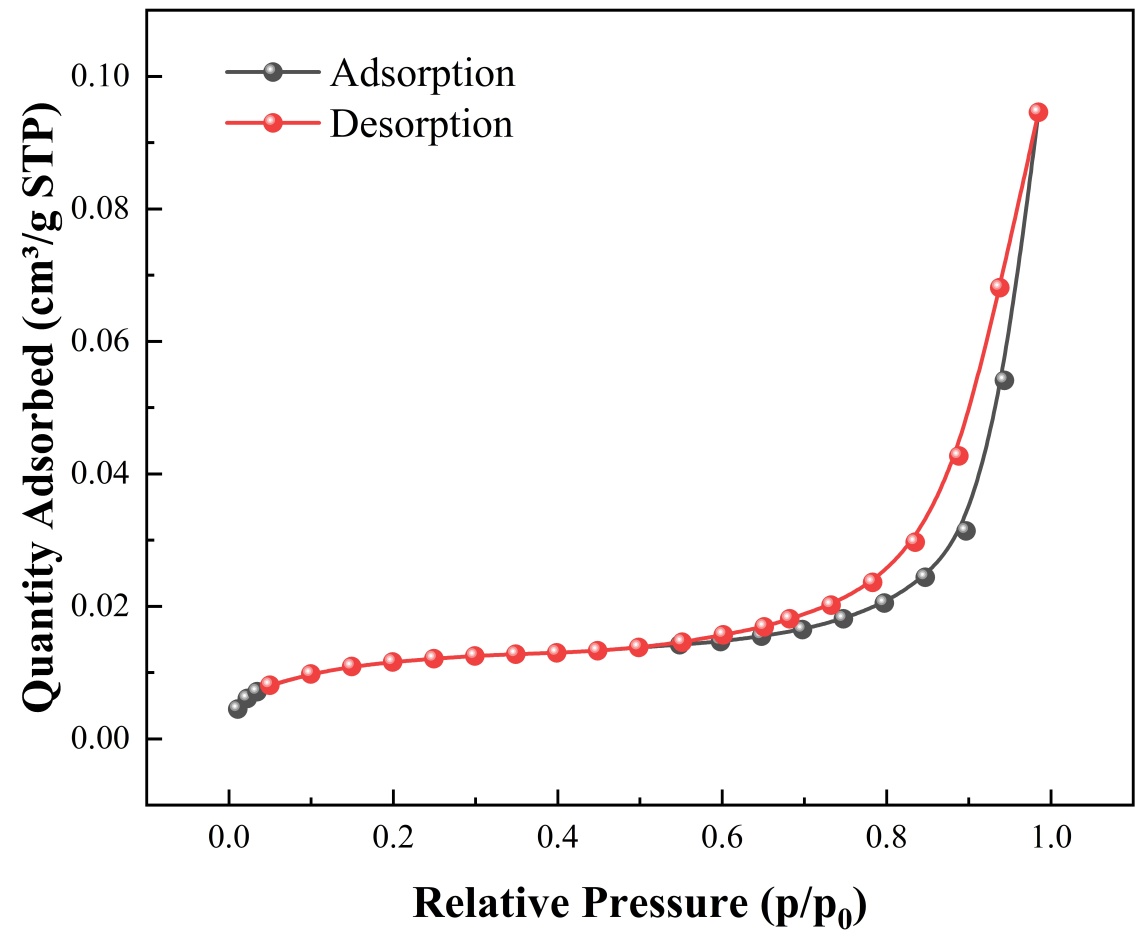 多点BET分析显示,水葫芦基CNFs比表面积0.043 ± 0.002 m2/g,虽低于酸水解法纤维素纳米晶(150~200 m2/g),但显著高于未处理纤维(0.012 ± 0.001 m2/g),增幅258%,且优于木材基CNFs (0.038 ± 0.002 m2/g) [1]。差异原因为KOH 溶液主要去除半纤维素与木质素,对纤维素结晶区影响小,未充分暴露吸附位点,同时三级研磨仅实现纤维横向切断,未形成大量端面微孔。另外,10.7% ± 0.5%残留木质素覆盖纤维表面,堵塞部分孔隙。BET方程C常数68.534 (>50),表明N₂与纤维表面吸附作用力强,源于纤维素羟基与N₂的氢键作用,与Abe等(2009)报道一致[2]。