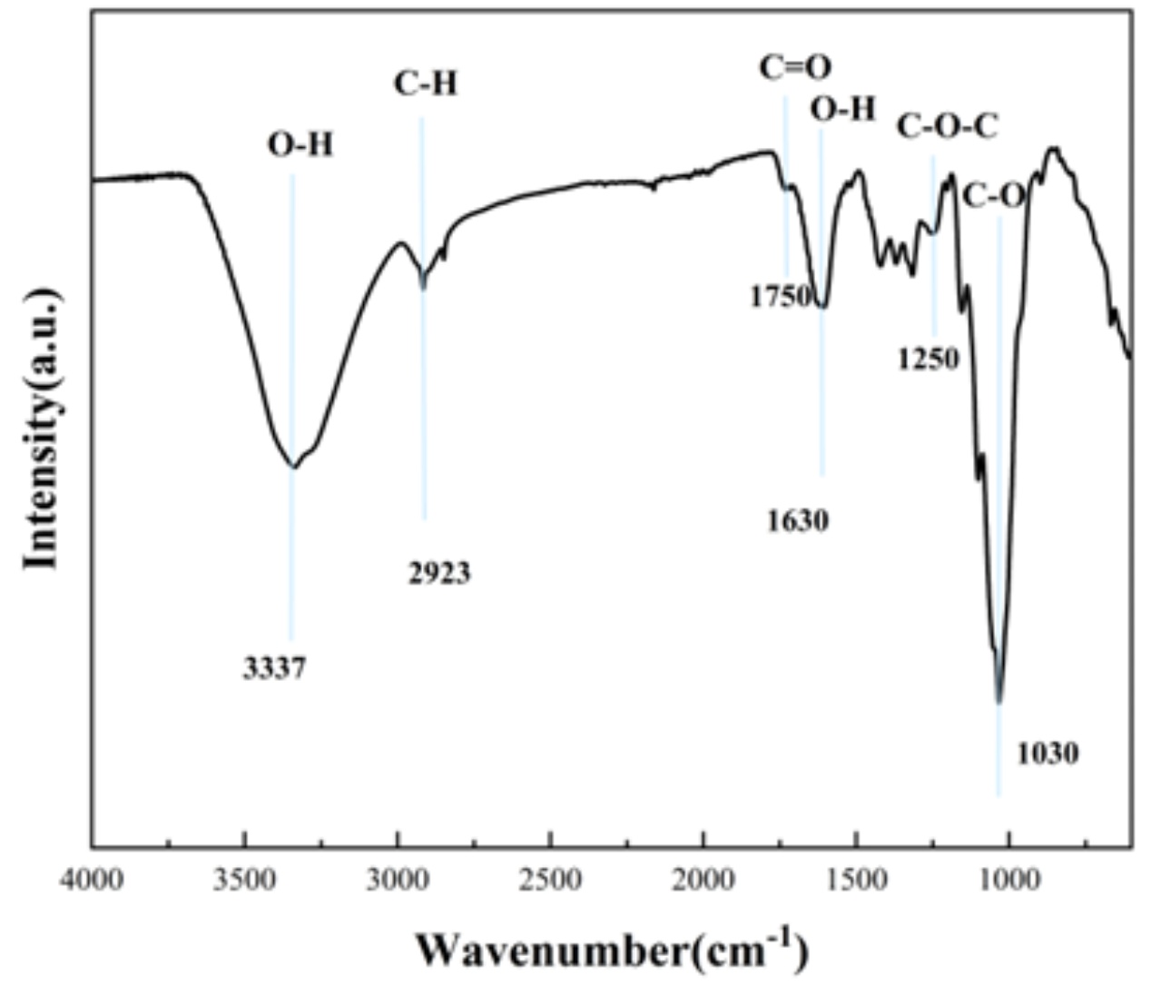 水葫芦基CNFs的傅里叶变换红外光谱图关键官能团峰变化如图4所示,1750 cm⁻1和1250 cm⁻1的峰值分别对应于木质素和半纤维素中的羰基(C=O)伸缩振动,以及木质素芳香醚键中的C-O-C振动。在1030 cm⁻1的带状吸收峰归因于吡喃环框架中C-O伸缩。位于3337 cm⁻1和1630 cm⁻1的吸收峰分别与纤维素O-H基团的伸缩和弯曲振动相关。最后,2923 cm⁻1的峰值对应于C-H键的伸缩振动。值得注意的是1750 cm⁻1处出现了一个额外的吸收峰。这是由于TEMPO氧化引入的羰基所致,表明纤维素中C6羟基被转化为羧酸根离子。光谱中仅出现一个小峰,表明这一反应选择性地氧化了C6位的初级羟基。