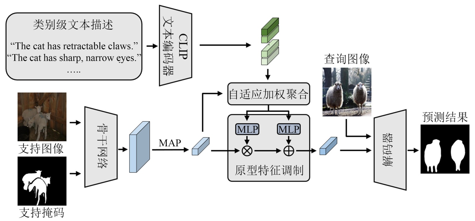 现有小样本语义分割方法大多采用基于原型匹配的范式[1],即通过支持集图像提取类别相关的视觉特征,并构建类别原型以指导查询图像的分割预测。但由于支持样本数量极其有限,支持原型往往难以充分刻画类别的整体语义特征,容易受到背景区域干扰以及类内外观差异的影响,从而导致原型表达不稳定,进而影响分割性能。尤其是在支持图像与查询图像存在显著视角变化、尺度差异或背景复杂度不一致的情况下,仅依赖视觉特征构建的原型往往难以准确对齐目标类别语义。为增强类别表示能力,部分研究尝试引入多尺度特征融合[2]或查询自适应更新[3]等策略,以缓解支持原型的噪声问题。然而,这些方法本质上仍局限于视觉模态内部的信息建模,难以从更高语义层面补充类别先验信息。
