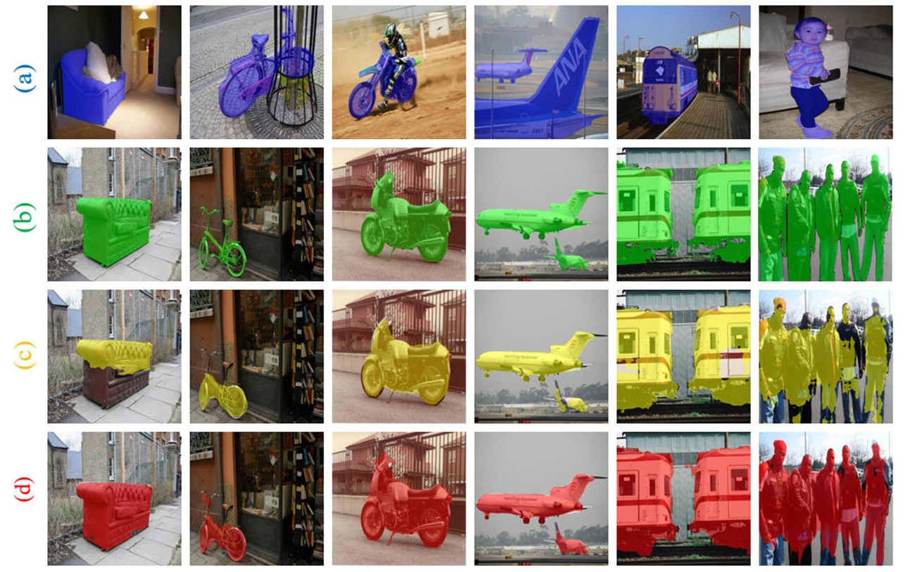 本小节通过可视化结果对模型的分割行为进行定性分析,具体结果如图3所示。其中,第(a)行展示支持集图像及其对应的掩码,第(b)行为查询图像及其真实掩码,第(c)行给出了基线模型BAM [25]的分割结果,第(d)行为本文方法的分割结果。可以观察到,相比基线方法,本文方法在目标边界刻画和背景干扰抑制方面表现出更为明显的优势。