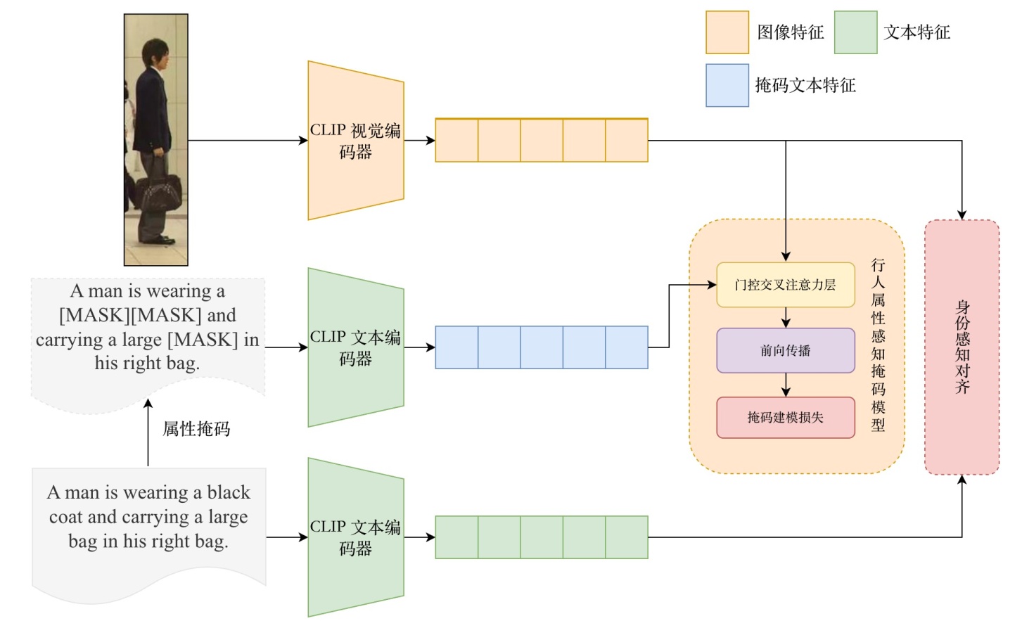 2) 设计了属性感知掩码建模(AAMM)模块。该模块通过显著性引导机制,在文本编码过程中重点挖掘并强化与行人关键属性相关的词汇语义,显著增强了文本特征在细粒度检索任务中的判别能力,使模型能够更精准地捕捉身份相关的关键线索。