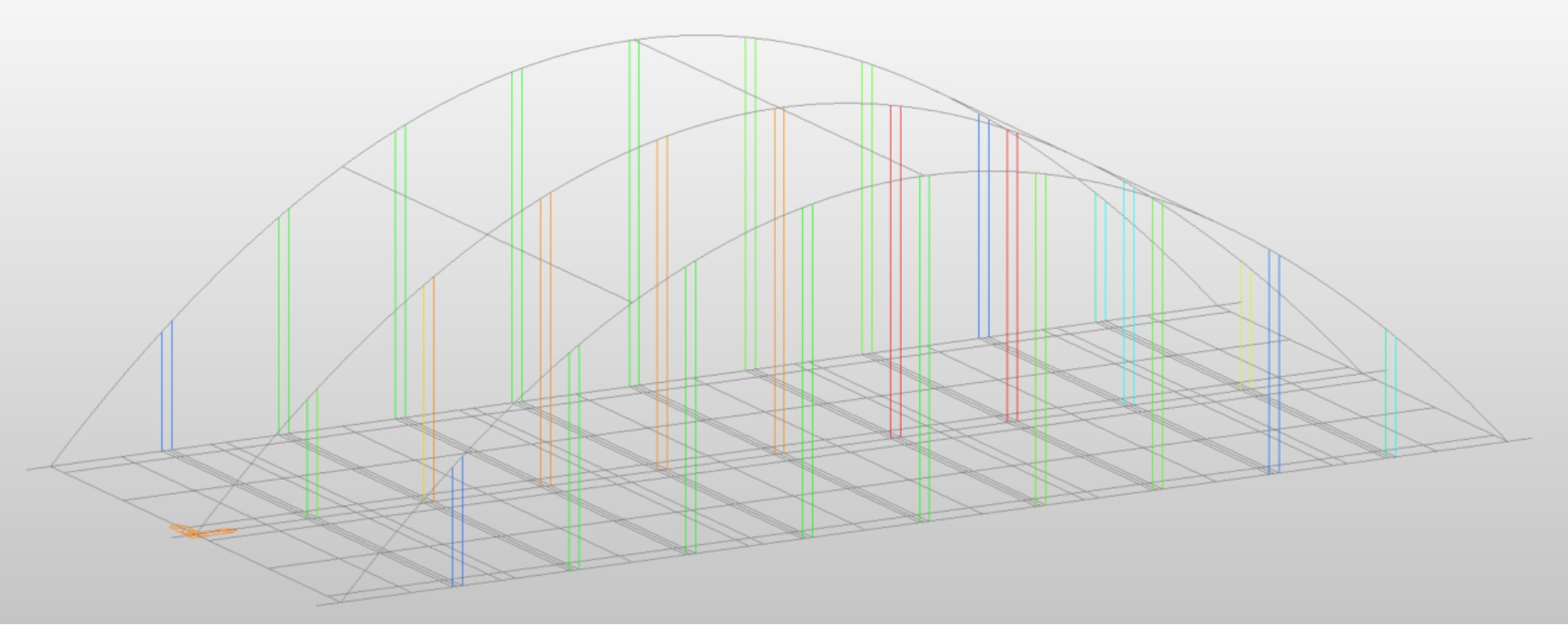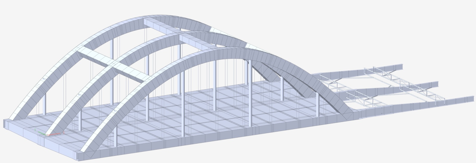 因此,需要在多拱面系杆拱桥的顶推施工过程中引入施工监控技术,对桥梁结构的整个顶推施工过程全程进行监控,实时监测顶推过程中多拱面系杆拱桥中拱肋、纵梁和横梁的应力和变形,不仅可以避免出现局部应力过大导致结构断裂或屈曲的情况发生,还可以控制结构变形处在安全范围内,防止出现失稳现象。