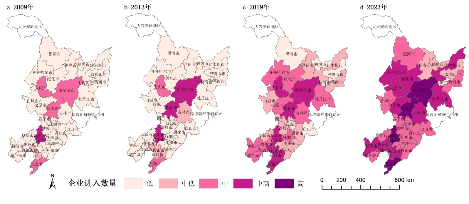 本研究采用ArcGIS空间分析技术开展作图分析,对2009、2013、2019、2023四个年份的东北三省战略性新兴产业企业进入与退出数量数据进行预处理,将企业数量与各地级市地理空间坐标进行关联匹配;再通过分级色彩渲染方法,按企业数量高低划分不同等级并赋予对应色系,生成企业进入与退出时空分布专题图,直观呈现各时段企业分布的空间集聚差异与演化态势,为后续时空格局特征分析提供可视化支撑。