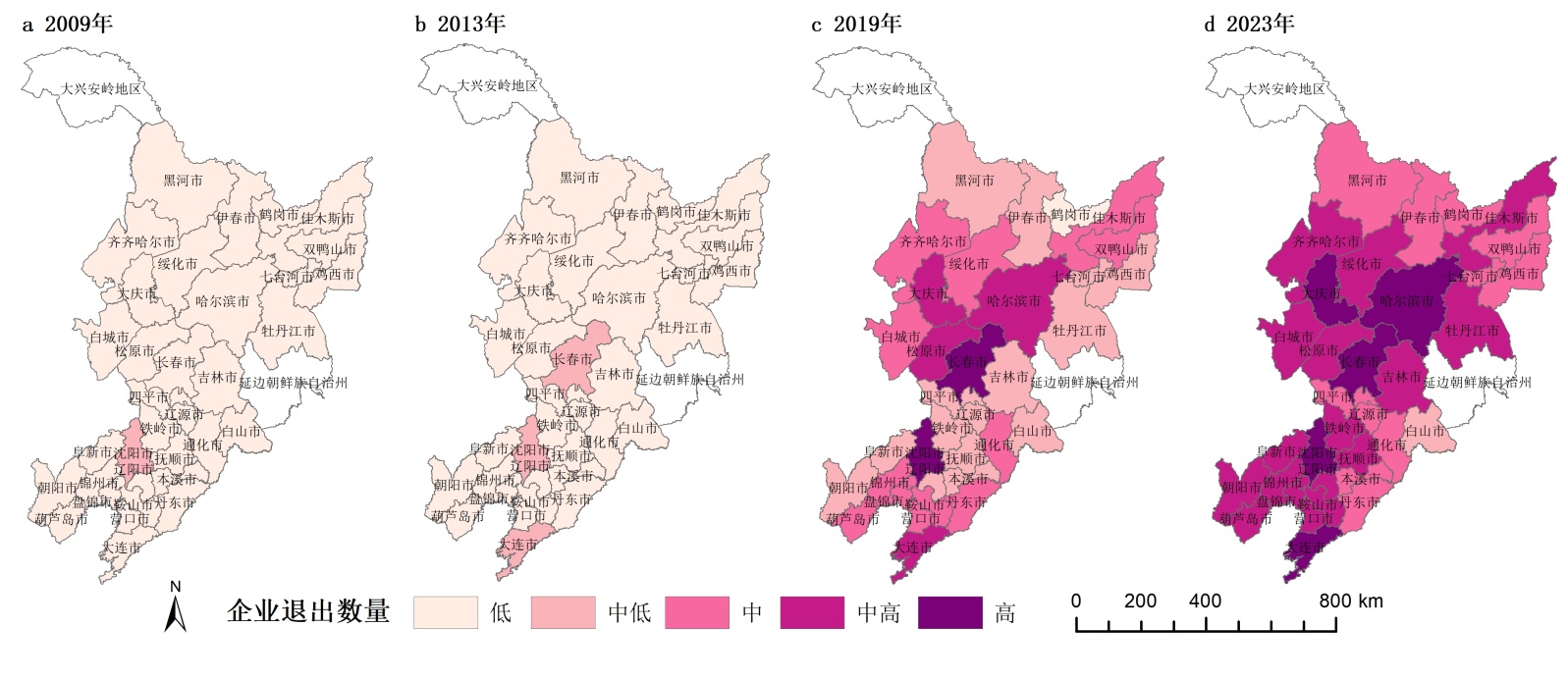2009~2013年(见图2),企业退出与进入格局高度契合,主要集中在沈阳、哈尔滨、长春等核心城市。这一阶段退出企业数量整体偏少,多为技术不成熟、适应市场能力弱的初创企业,其他城市因进入企业少,几乎无退出记录,呈现“核心有退出、全域少退出”的态势。