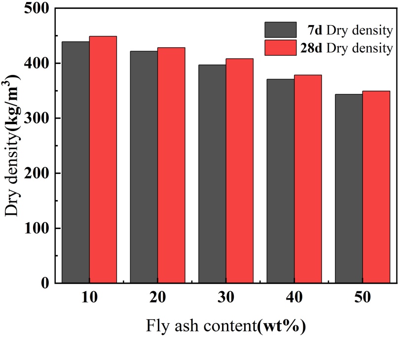图4显示不同粉煤灰替代量对保温腻子干密度的影响。结果表明,随粉煤灰替代量增加,7 d及28 d干密度持续降低。主要原因为:粉煤灰为轻质填料,密度远小于水泥水化产物[20]。且粉煤灰活性较低,替代水泥后仅少量参与水化反应,因此显著降低了保温腻子的整体密度[21]。此外,粉煤灰在搅拌中易引入气泡,形成多孔结构,进一步减小了干密度。