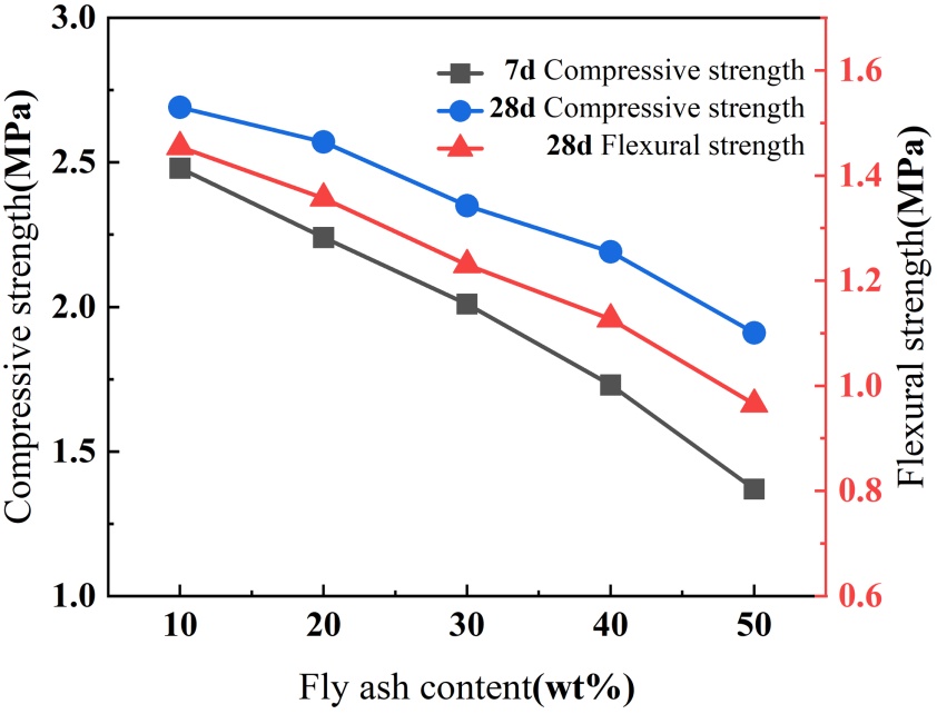 Figure 6. The influence of fly ash content on compressive strength and flexural strength