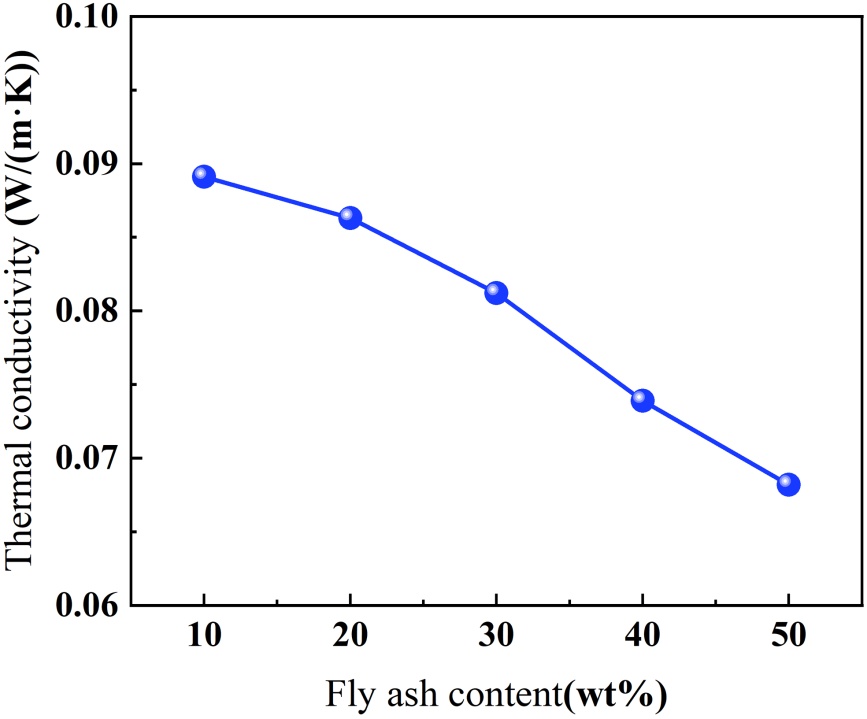 图8显示不同粉煤灰替代量对保温腻子导热系数的影响。随粉煤灰替代量增加,导热系数逐步下降,降幅分别为3.14%、5.91%、8.99%、7.71%,且在40 wt%时降幅逐渐增大。这是因为粉煤灰具有低导热系数的孔隙结构,替代水泥后,保温腻子整体导热系数降低。在掺量较小时,材料密实度增加虽增强固体热传导,但不足以抵消粉煤灰替代水泥带来的导热性降低。随着替代量增加,粉煤灰的孔隙结构提升了材料整体孔隙率,孔隙内空气(低导热系数)增多,主导了材料整体导热系数的进一步降低,且降幅随之增大。